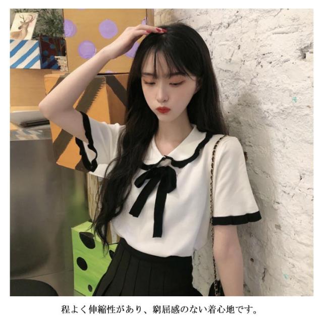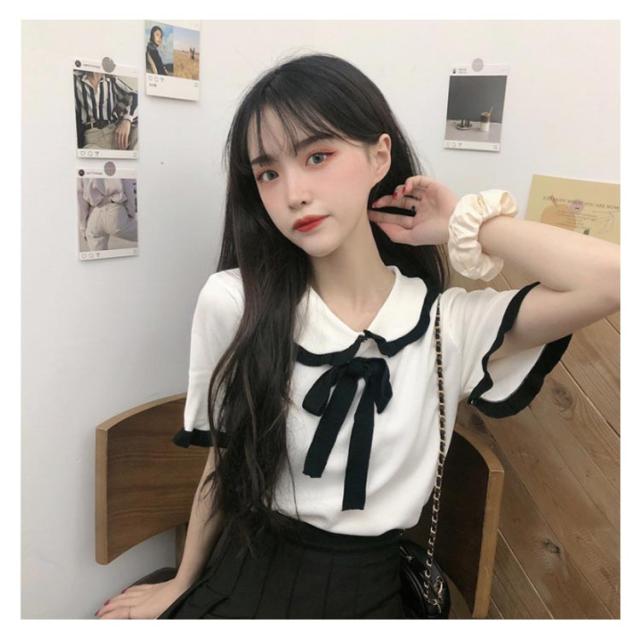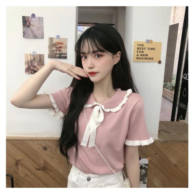 | 丸襟付きのサラッと快適なサマーニットが登場します! フリル&リボンのデザインが施されており可愛さがたくさん詰まりました。 涼しく薄手なニット素材で、夏でも快適に着れます。 程よく伸縮性があり、窮屈感のない着心地です。 1枚で存在感のあるのでボトムはシンプルなものでもお洒落になっちゃいます! | |