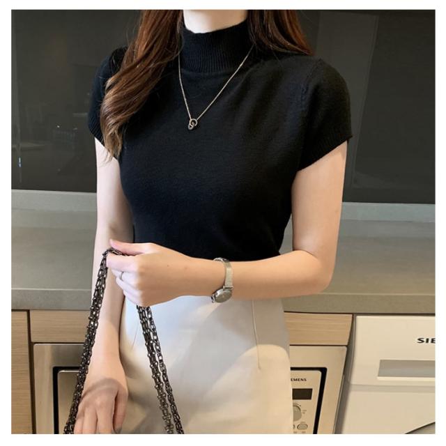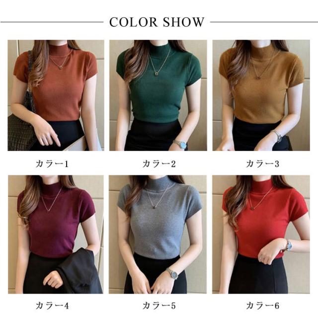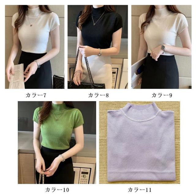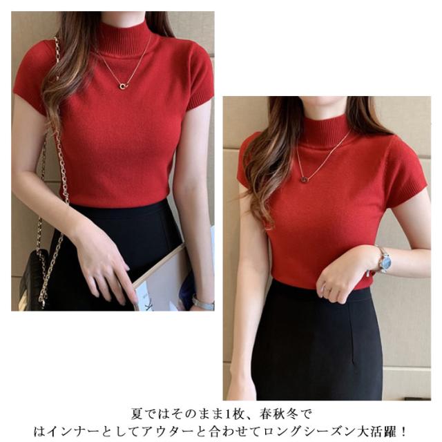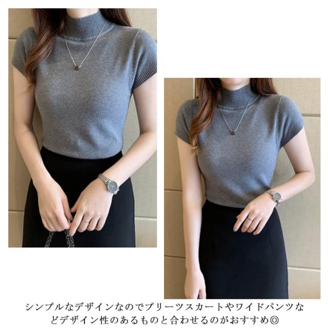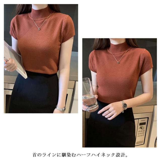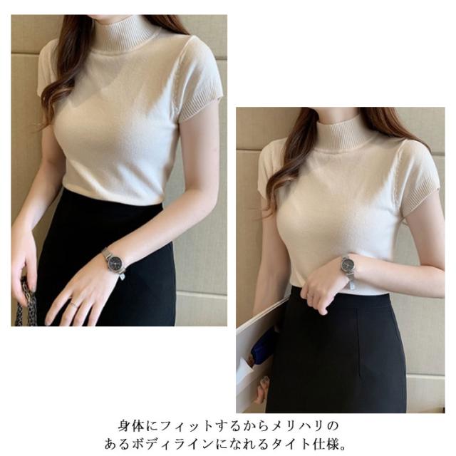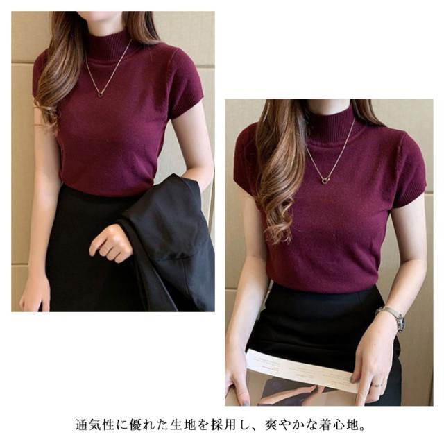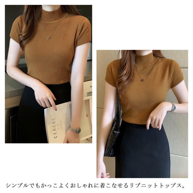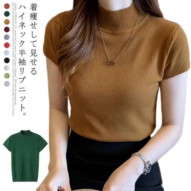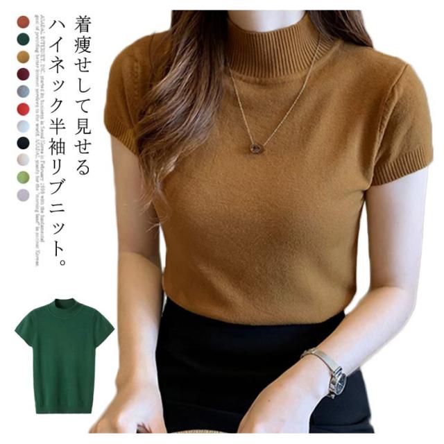 送料無料 リブ タイトニット トップス レディース 半袖 ニットカットソー サマーニット プルオーバー ハイネック リブニット きれいめ ニットセーター 薄手 ストレッチ 伸縮性 抜け感 お洒落 カジュアル 大人可愛い 夏 重ね着 レイヤード
