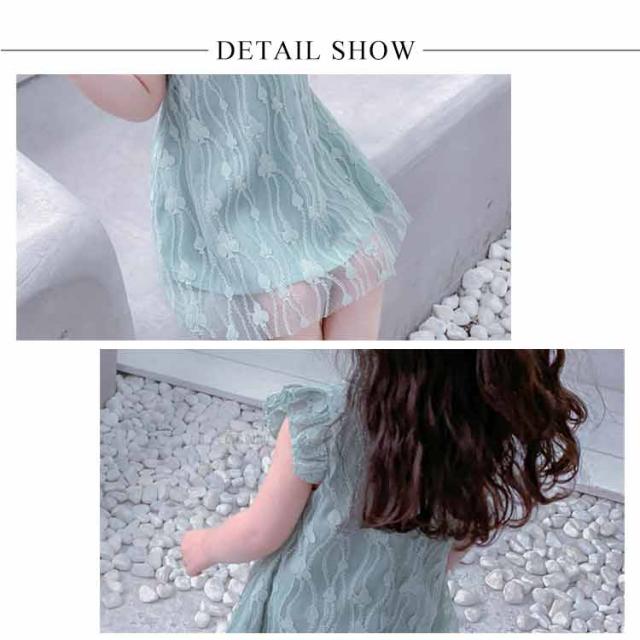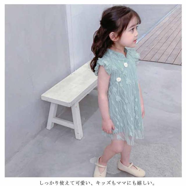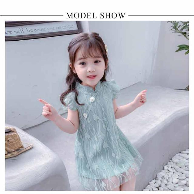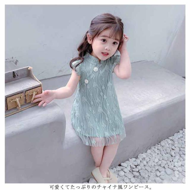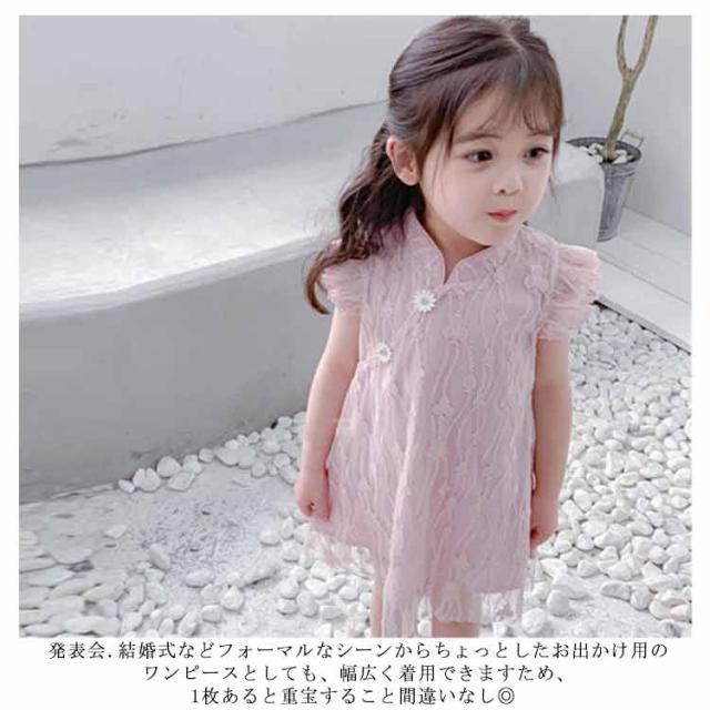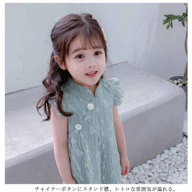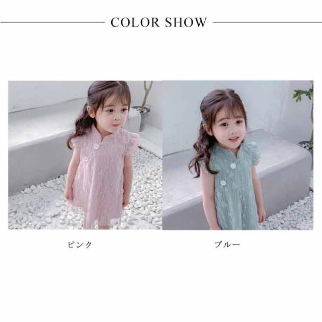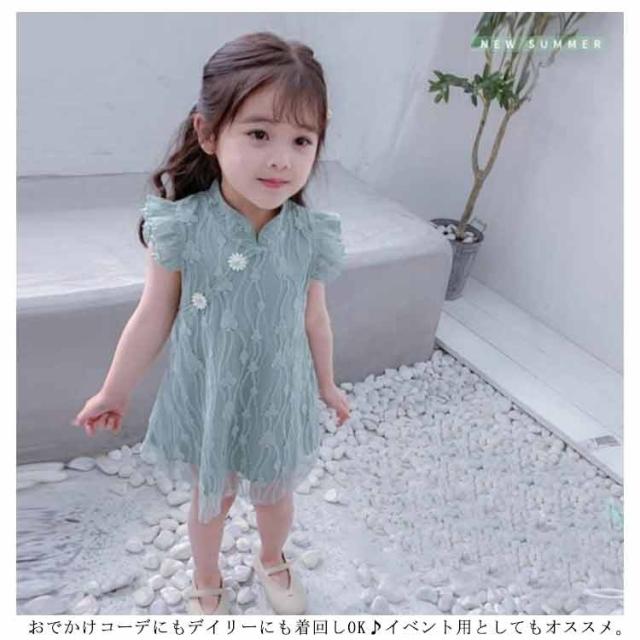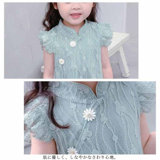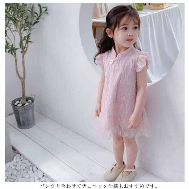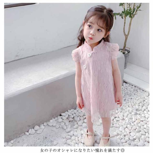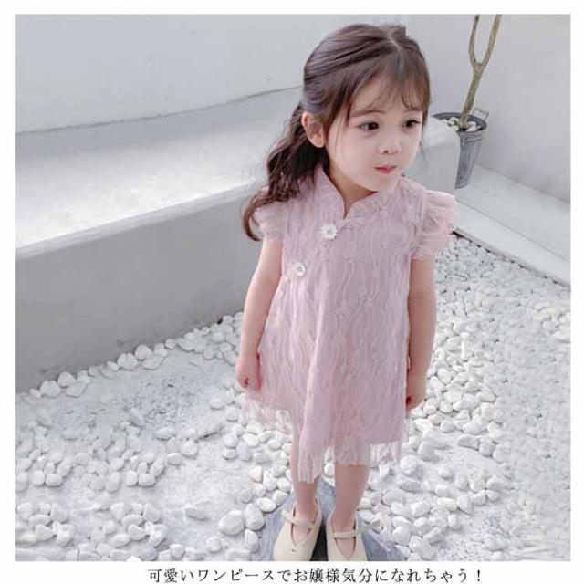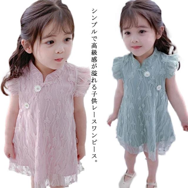 送料無料ワンピース キッズ チャイナドレス風 2色 可愛い オシャレ レースワンピース ショート丈ワンピース フリル袖 スタンド襟 総レース 女の子 韓国風 ミニ丈 春夏 子供服 キッズ ノースリーブ ドレス お洒落 キュート