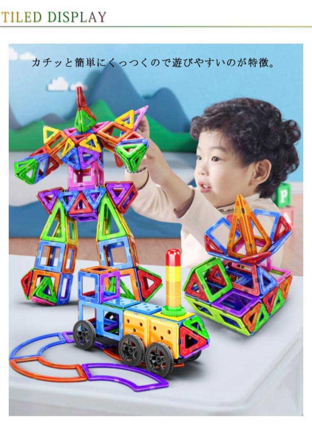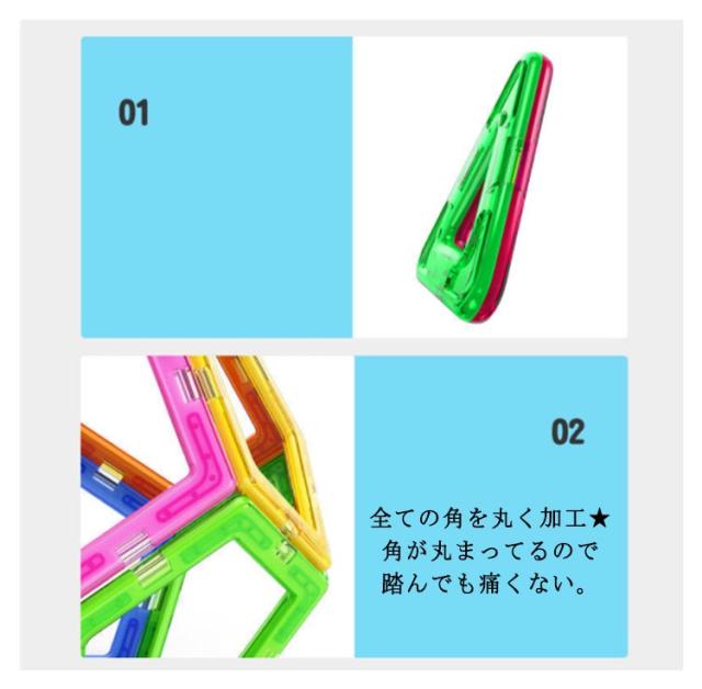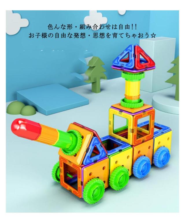 | (商品名)知育玩具 (入数)収納ケース付き(約30ピース入り) (素材)ABS 磁石 (特徴)表現力・認識力・想像力・思考力を引き出し、遊びと教育が同時にできる知育マグネットブロックです。カラフルな配色は幼児の色彩感覚を伸ばすことができます。平面をつなぎ合わせてパターンを作ることや、色の組み合わせを考えることから始まり、多面体構造を作ることまで楽しめます。色んな形・組み合わせは自由!!お子様の自由な発想・思想を育てちゃおう☆誕生日、クリスマス、入園祝い、入学祝い、新年などに子供へのプレゼントとしては最適です。 | |