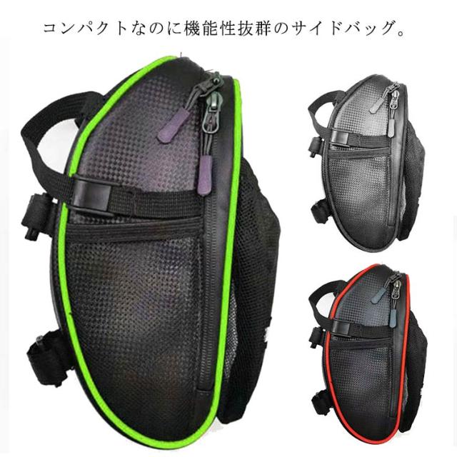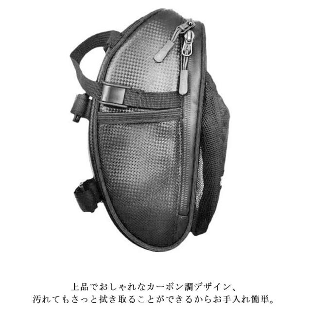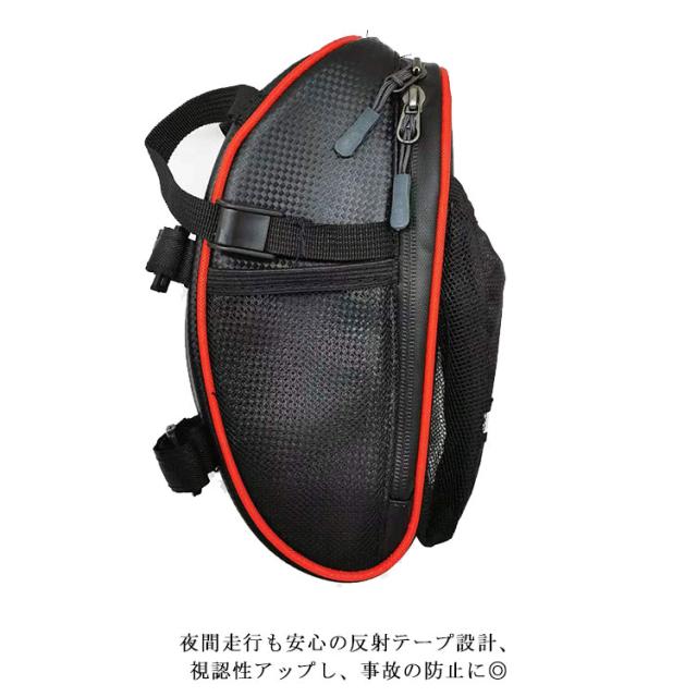 | コンパクトなのに機能性抜群のサイドバッグ。 防水生地を採用し、且つ止水ファスナーで防水性抜群で、急な雨でもとても安心◎ サングラス、財布、鍵、スマホ、小工具、補給食など色々ものを収めることができます。さらに、外側メッシュポケットがボトルや水筒、傘収納できるから、いつでも水分補給ができます。 夜間走行も安心の反射テープ設計、視認性アップし、事故の防止に◎ 上品でおしゃれなカーボン調デザイン、汚れてもさっと拭き取ることができるからお手入れ簡単。 ロードバイク、マウンテンバイク、クロスバイクなど様々な車種に対応できます。 | |