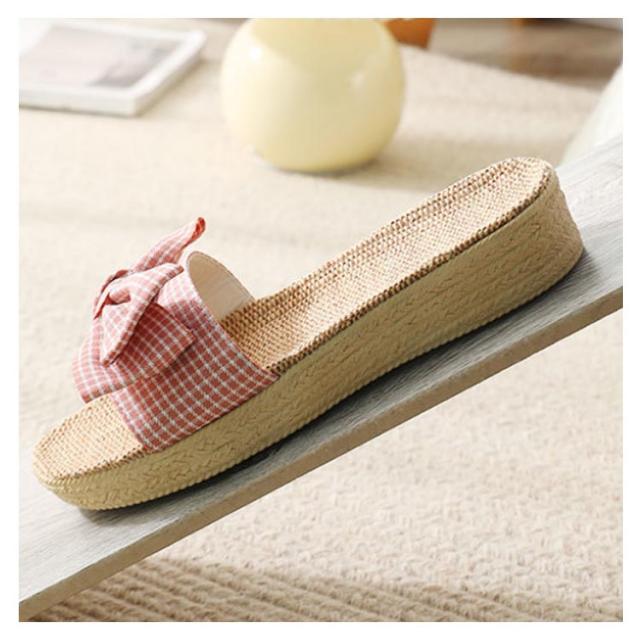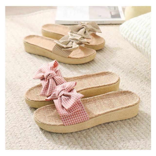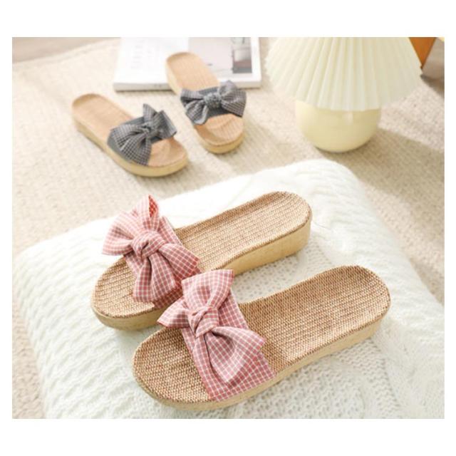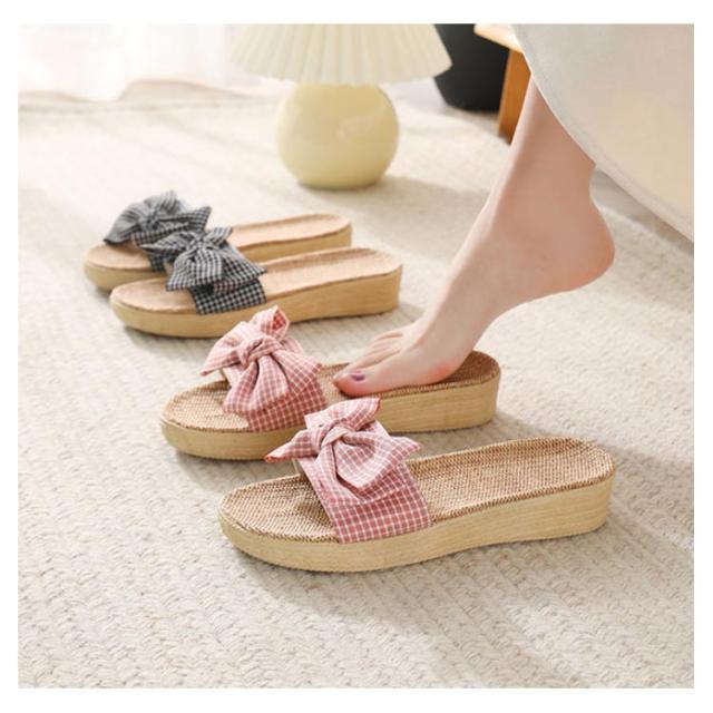 レディース 四節 リネンスリッパ チェック柄 軽量 履きやすい 夏 厚底 リボン かわいい ルームシューズ シューズ 夏靴 ルーム ロヒール 女性 シンプル おでかけ 通気性 滑る止め ヒール4cm