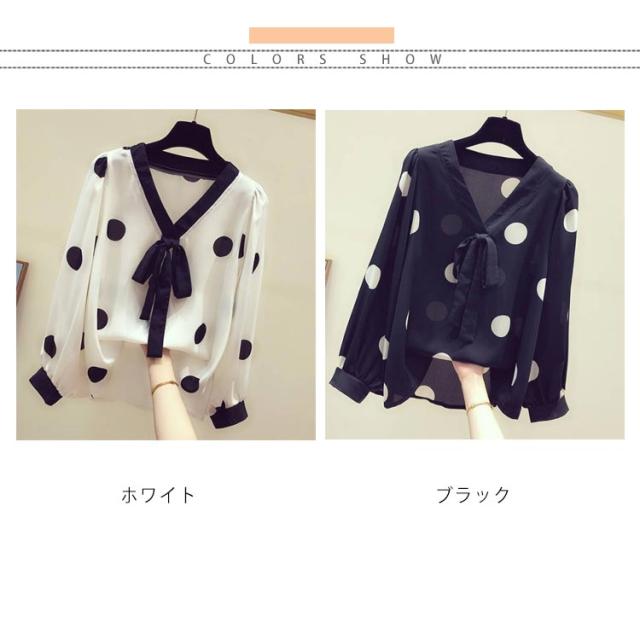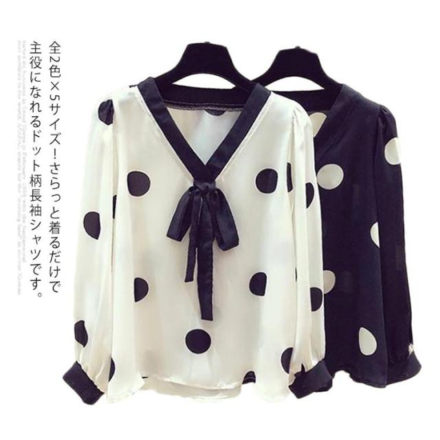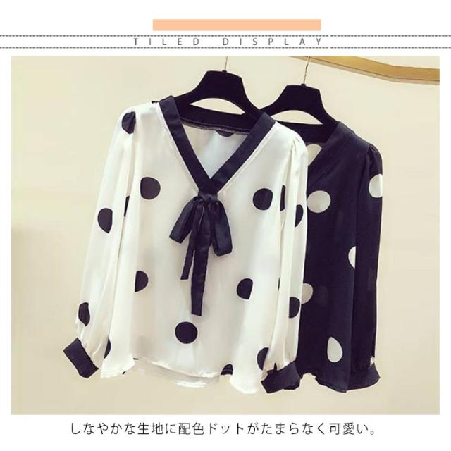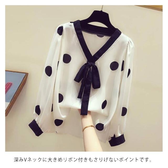 ドット柄シャツ ボウタイシャツ ボウタイ リボン付き シャツ ブラウス トップス レディース Vネック 水玉柄 ドット柄 春夏 シンプル おしゃれ 送料無料