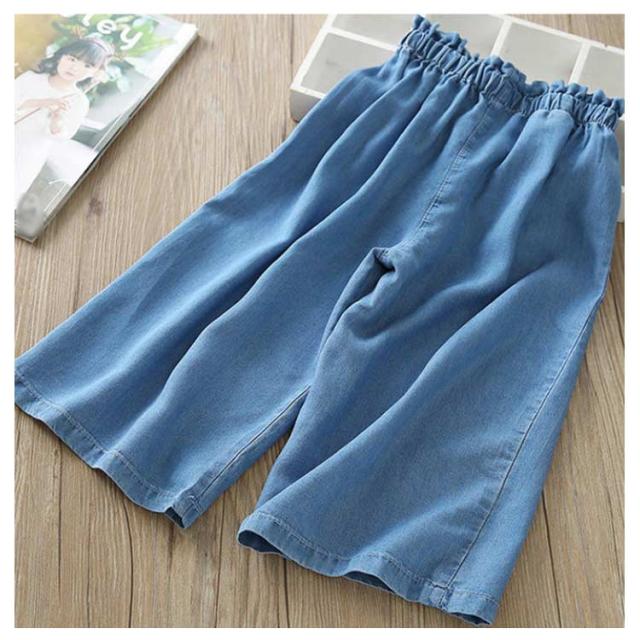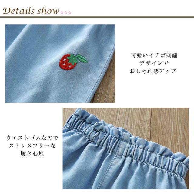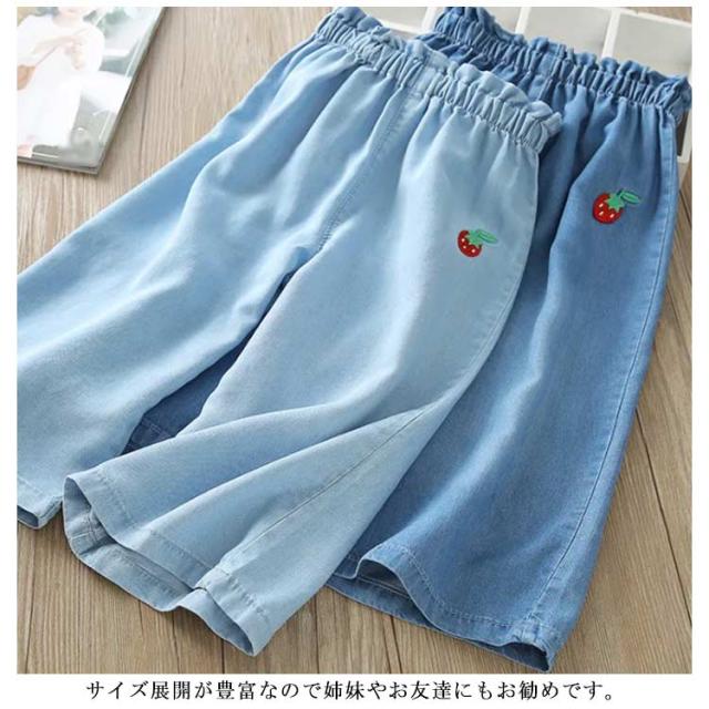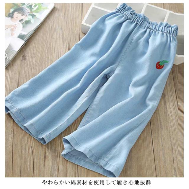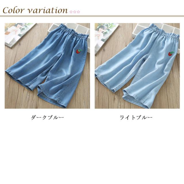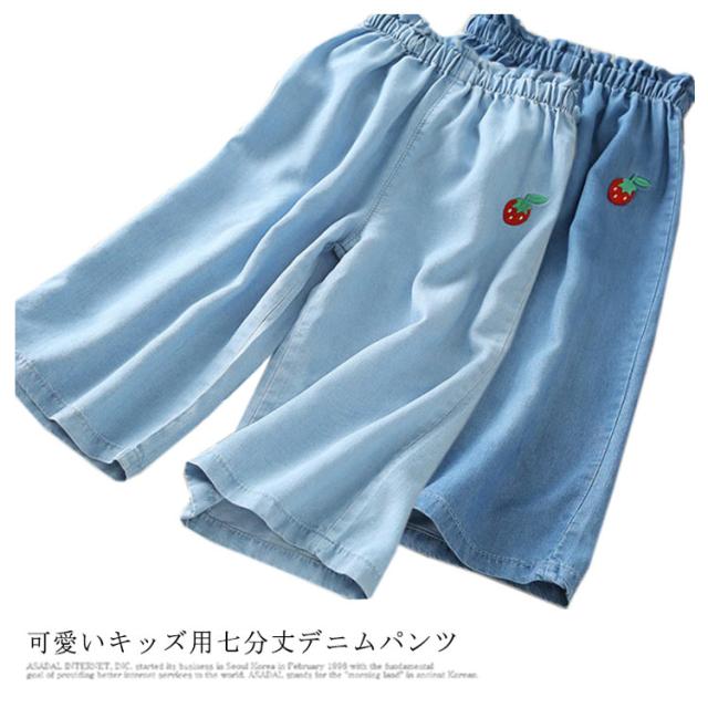 デニムパンツ 七分丈 キッズ ワイドパンツ ガウチョパンツ 女の子 子供服 7分丈 ボトムス 送料無料 ジュニア ゆったり ウエストゴム カジュアル おしゃれ 柔らかい 薄手 イチゴ 刺繍 無地 通学 夏 100cm-150cm 可愛い 韓国ファション