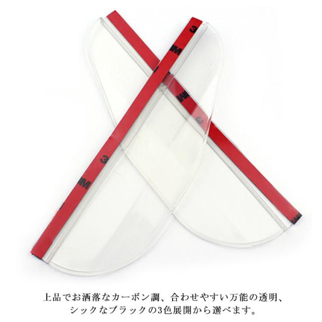 | 雨の日も雪の日も安心のミラーバイザー。 水滴対策にバッチリ!サイドミラーに付けるだけで、走行中もミラーが濡れず、雪も積もらないから、視界を確保し、より安全な運転をサポート! 柔軟性のある素材なので、様々な車種に対応できます。 上品でお洒落なカーボン調、合わせやすい万能の透明、シックなブラックの3色展開から選べます。 取り付けも簡単!取り付ける位置を綺麗に拭き取り、製品のテープを剥がして、サイドミラーの曲線に沿って貼り付けます。 超強力の3M両面テープなので、しっかり貼り付けます。 | |