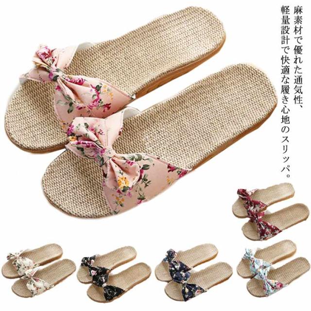 送料無料 スリッパ レディース ルームシューズ 涼しい 夏用 かわいい リボン ジュート スリッパサンダル ビーチサンダル 亜麻 リネン 春夏 快適 室内履き 洗える 蝶結び フラットソール かわいい 婦人 女性 おしゃれ 綿麻 通気 滑り止め 部屋用 来客用 シンプル 軽量