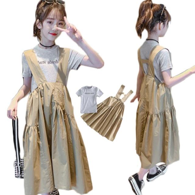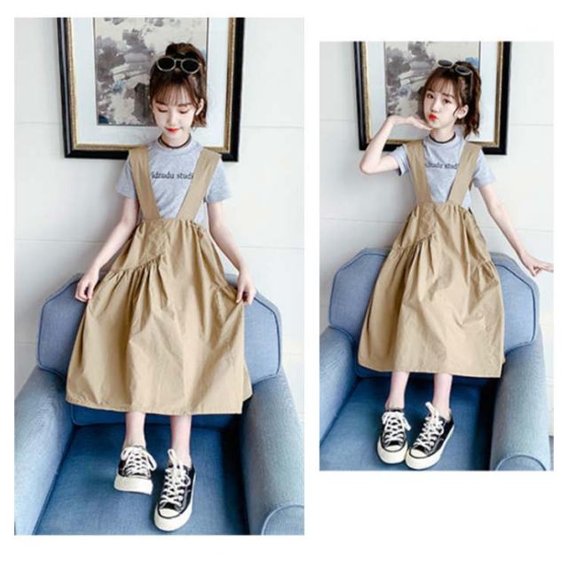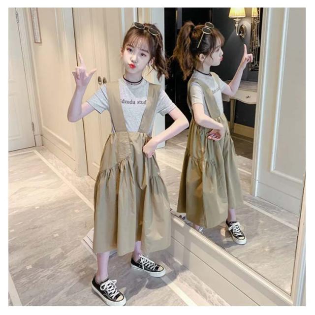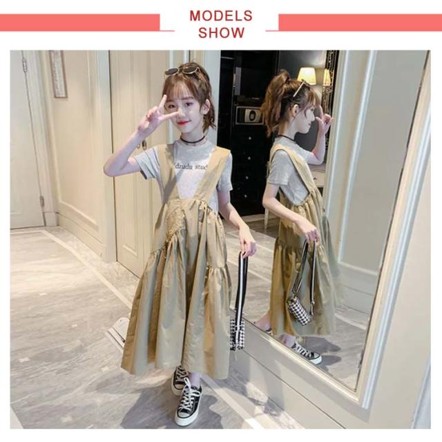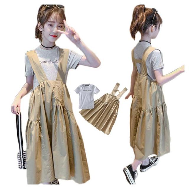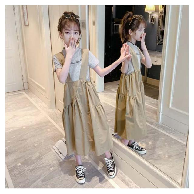 キッズ サロペットワンピース 夏 ワンピース 二点セット 半袖 Tシャツ 女の子 子供 ジュニア 子供サロペットスカート 韓国 子供服 七分丈 フリルワンピース ロングワンピ タンクトップ 送料無料
