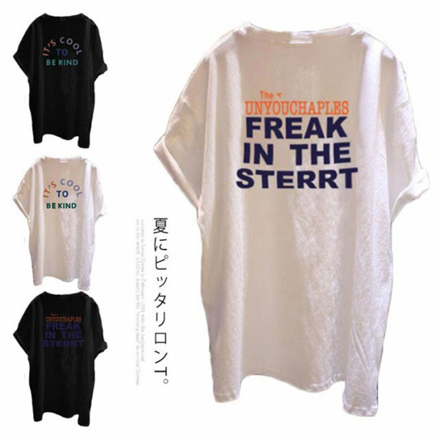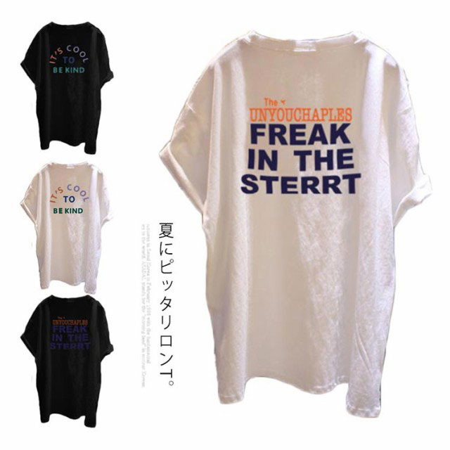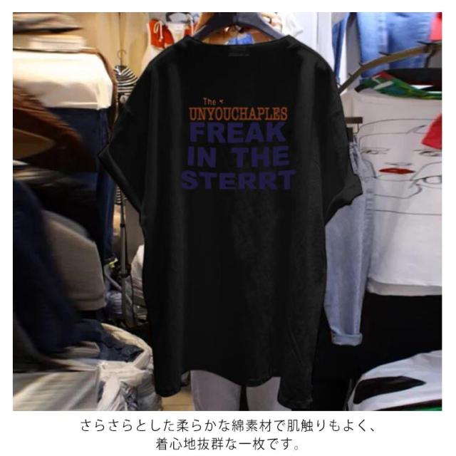 ロングT ロングtシャツ レディース 半袖 ゆる Tシャツ ドロップショルダー ロングティーシャツ 五分袖 クルーネック ダンス衣装 体型カバー 送料無料 英字 カジュアル 夏