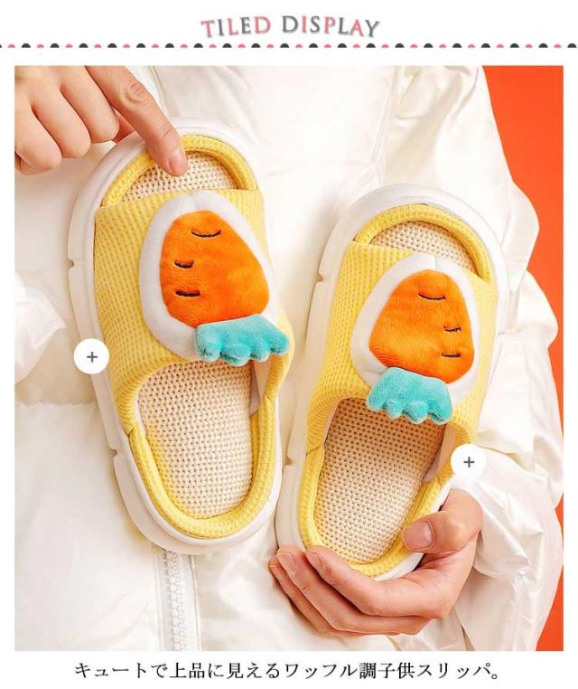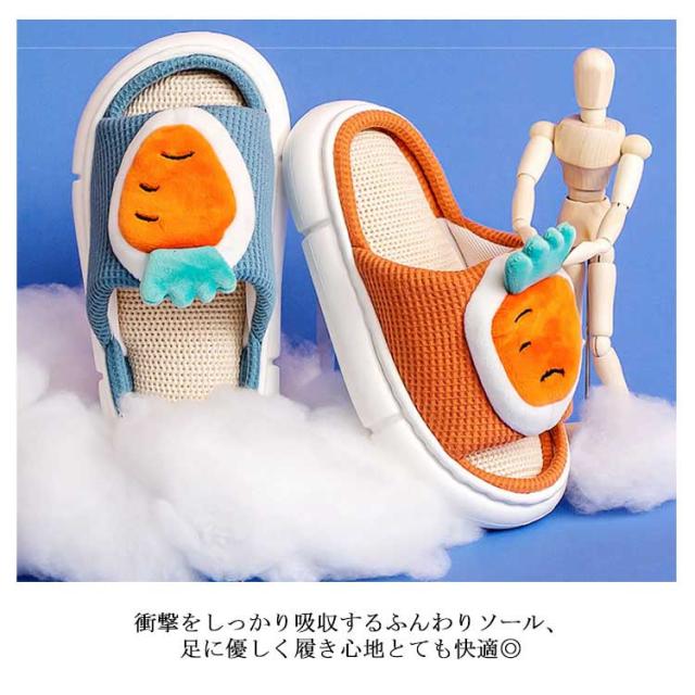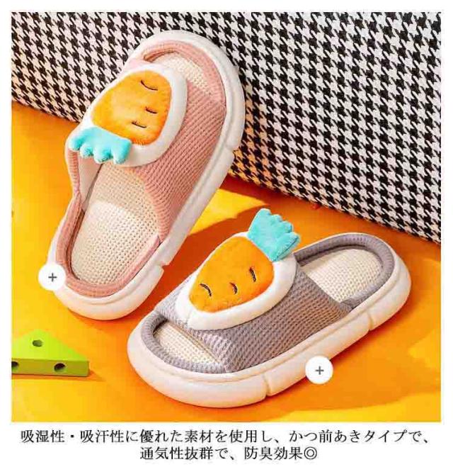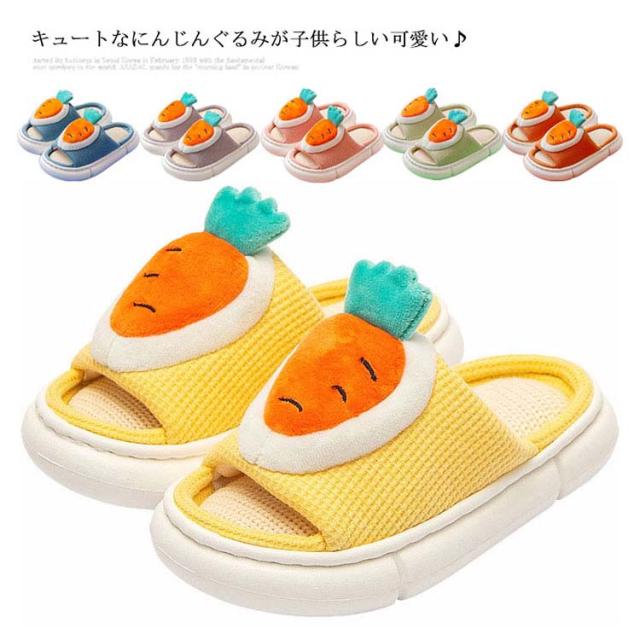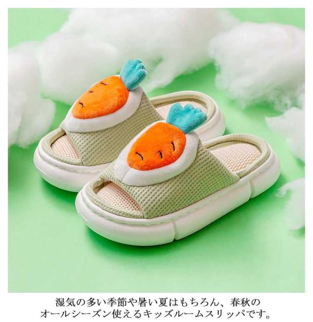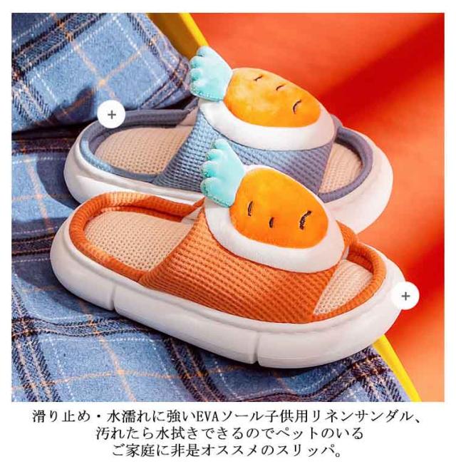 | キュートなにんじんぐるみが子供らしい可愛い♪ キュートで上品に見えるワッフル調子供スリッパ。 衝撃をしっかり吸収するふんわりソール、足に優しく履き心地とても快適◎ 滑り止め・水濡れに強いEVAソール子供用リネンサンダル、汚れたら水拭きできるのでペットのいるご家庭に非是オススメのスリッパ。 吸湿性・吸汗性に優れた素材を使用し、かつ前あきタイプで、通気性抜群で、防臭効果◎ いつもさらさら涼しい素材なので、ぜひ素足で履いて欲しいルームシューズです。 底面は滑りにくく水濡れに強く丈夫なEVA素材を使用し、室内履きはもちろん、ベランダやお庭用のサンダルとしてもおススメ。 手洗いできるからいつでも清潔でキープできるのも嬉しいポイント。 湿気の多い季節や暑い夏はもちろん、春秋のオールシーズン使えるキッズルームスリッパです。 | |