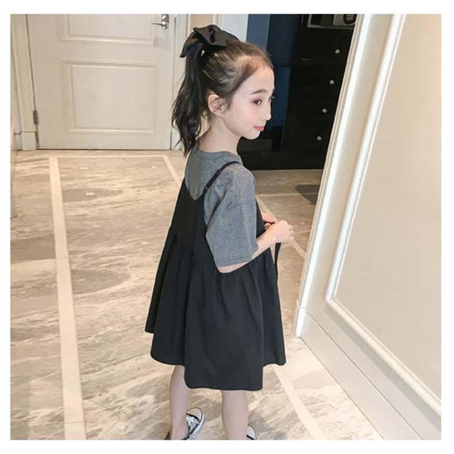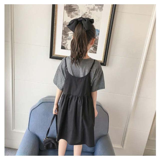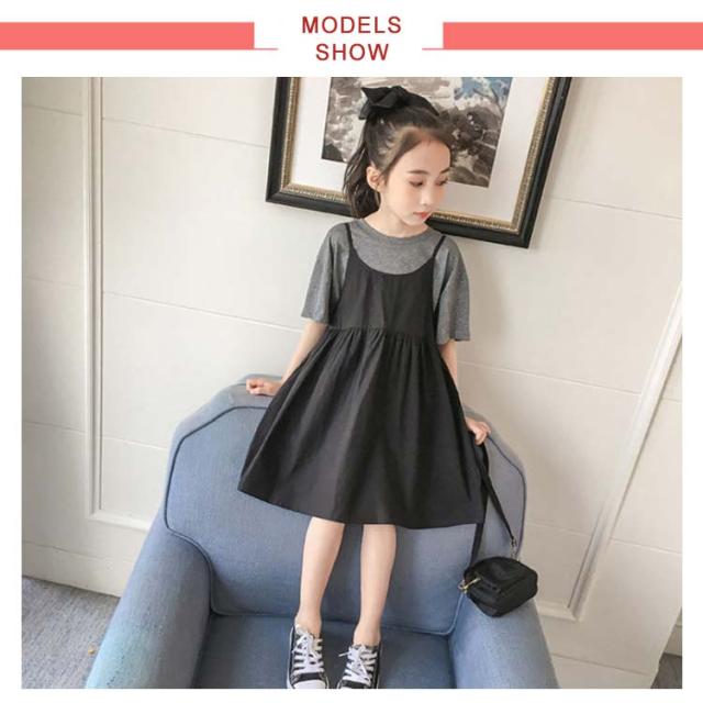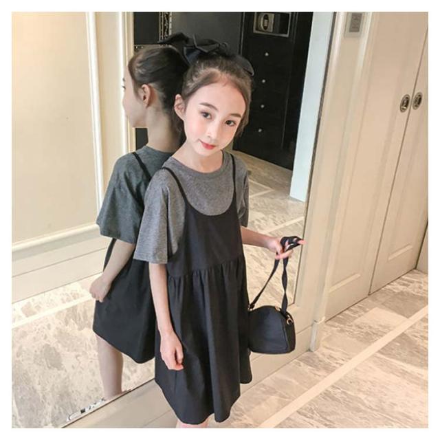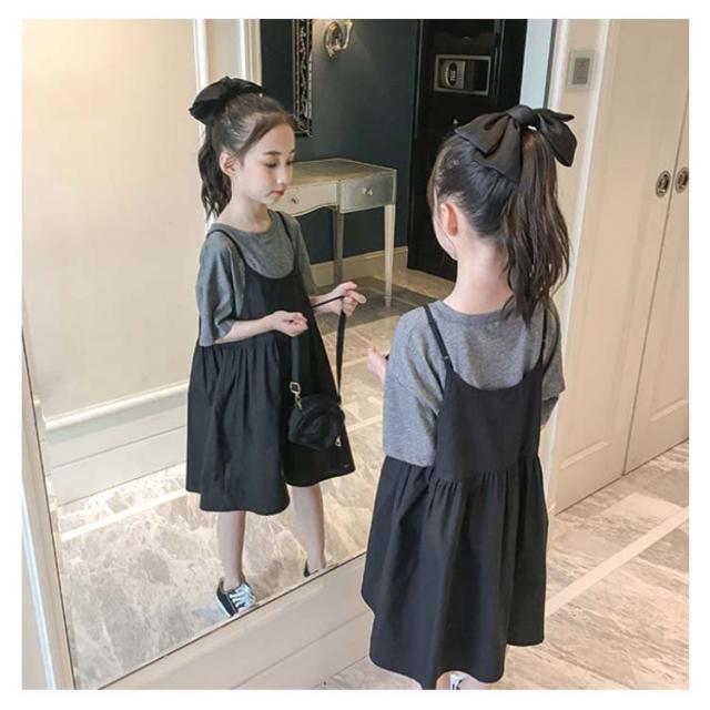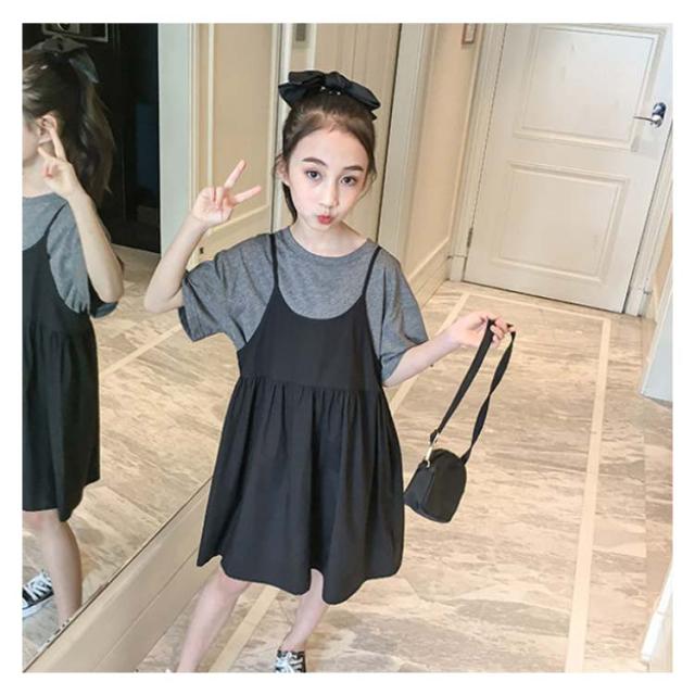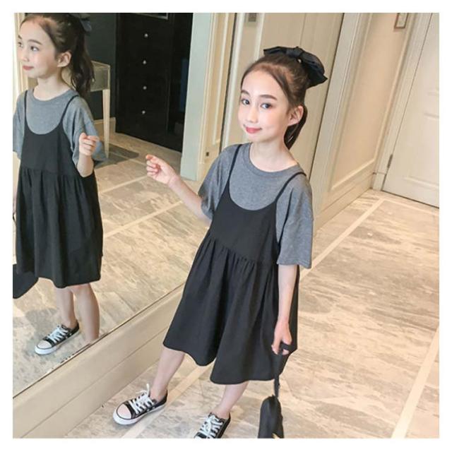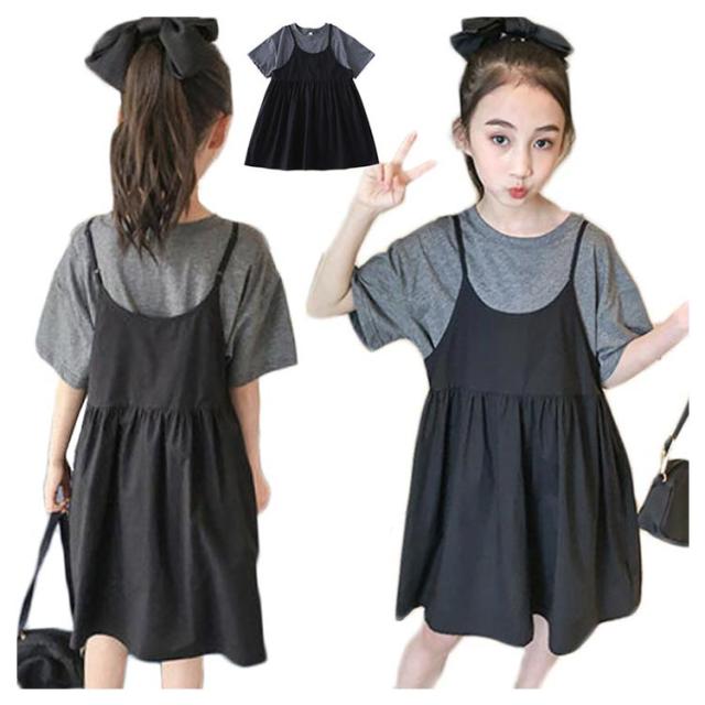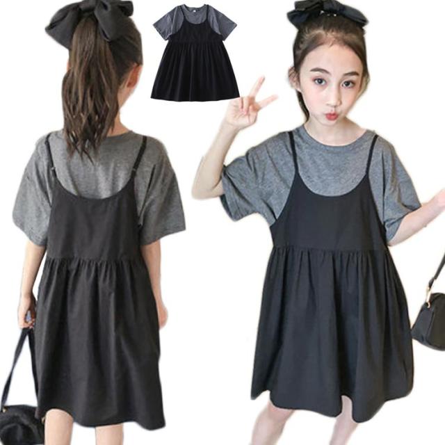キッズ 夏 サロペットワンピース 二点セット ブラウス トップス サロペットキャミソール 半袖 無地 丸襟 ミディアム丈 プリーツ セットアップ 子供服 キッズ服 ワンピースおしゃれ かわいい 送料無料