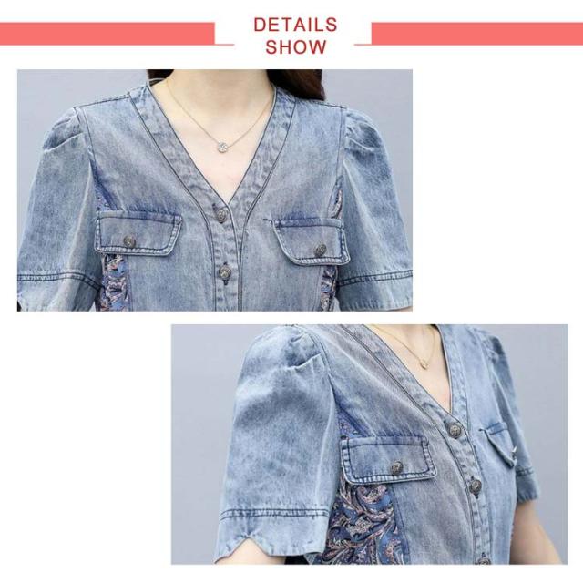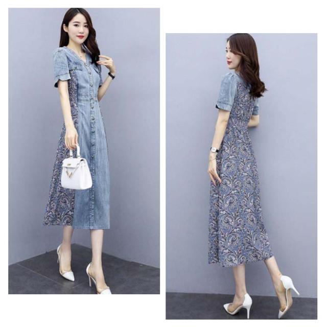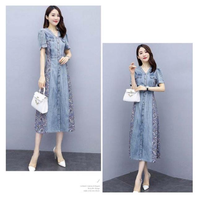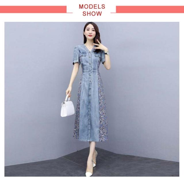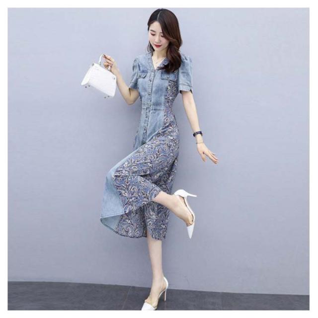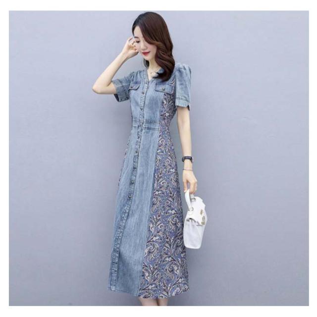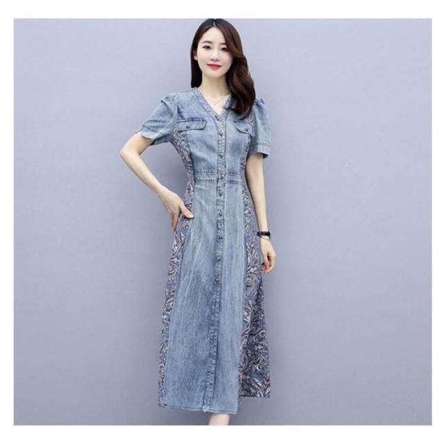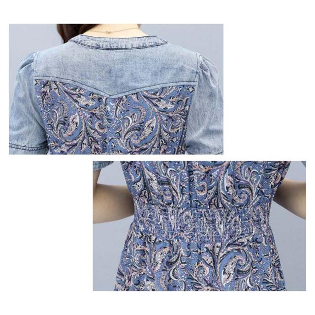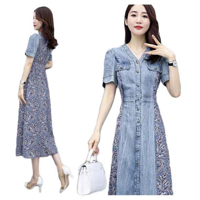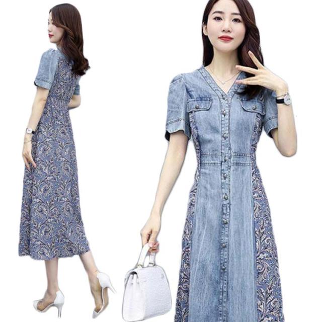 レディース ワンピース ロングワンピース デニムマキシワンピース ミモレ丈 夏 ワンピース 半袖 Aライン Vネック デニムワンピース デニム ウエストゴム ストレート 花柄 送料無料
