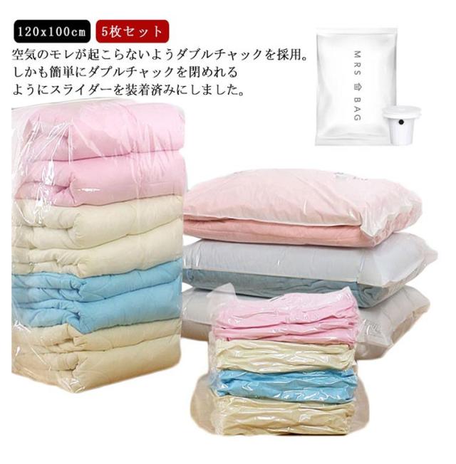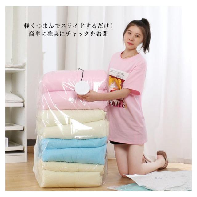 | 空気のモレが起こらないようダブルチャックを採用。しかも簡単にダプルチャックを閉めれるようにスライダーを装着済みにしました。 軽くつまんでスライドするだけ!商単に確実にチャックを密閉 圧縮袋で保管することで、収納の空きスペース以外にも「湿気」「ダニ」「カビ」「ほこり」「臭い」をしっかりガードできるメリットが! 5枚セット | |
