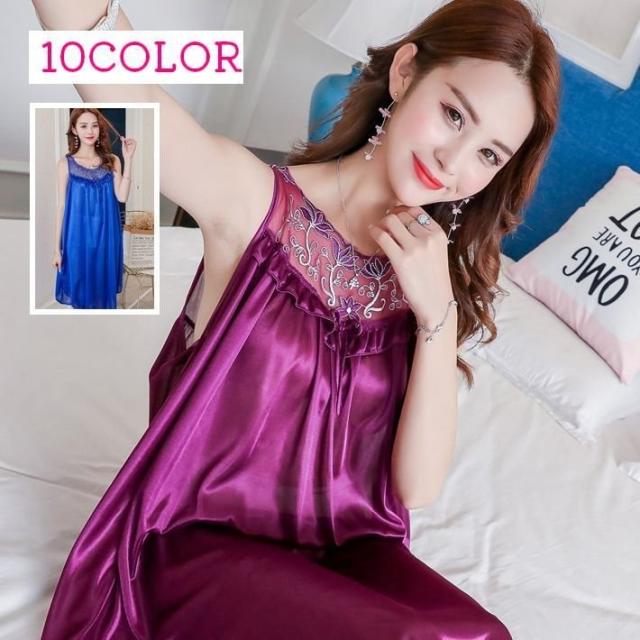 ネグリジェ レディース ルームウェア ナイトウェア ノースリーブ ラウンドネック レース フリル リボン サテン調 パジャマ