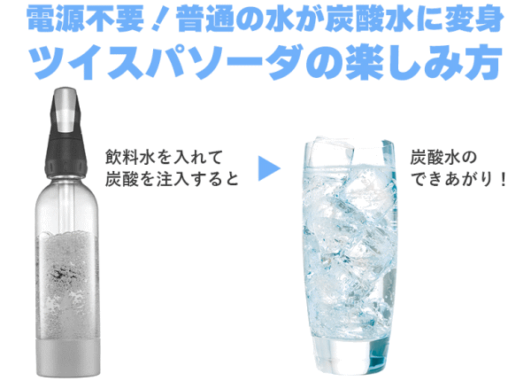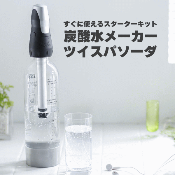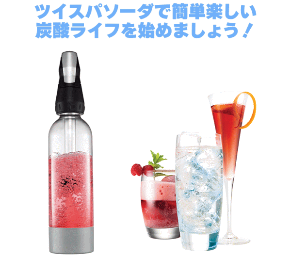 水・ジュース・お酒を炭酸にできるソーダマシン「ツイスパソーダ」。ご家庭でカンタンに炭酸水が作れるソーダマシン。水だけなくジュースやお酒も直接炭酸にできます。パーティやアウトドアでも大活躍!■仕様【ソーダマシン】サイズ[ボトル+ノズル]W84×D84×H384mm/本体重量450g/容量950ml/保証期間2年間(ノズルのみ)【炭酸カートリッジ】内容物:二酸化炭素(E290、食品添加物)/サイズW18×D18×H65mm/容量最低11ml/重量約29g(二酸化炭素約8g)■付属品:ノズル、ボトル、ボトルキャップ、炭酸カートリッジ×6、取扱説明書/2年間保証書(ノズルのみ)、レシピブック※炭酸カートリッジはスパークリング1回に対して1個の使い切りとなります。水やジュース、アルコール飲料など水分以外のもの(固形物)をスパークリングしないで下さい。乳飲料など油分を含んだものをスパークリングしないで下さい。果肉等を含んだ飲料をスパークリングすると大量の泡が発生しますので泡がしずまるまでノズルをゆるめないで下さい。業務用途には使用しないで下さい。