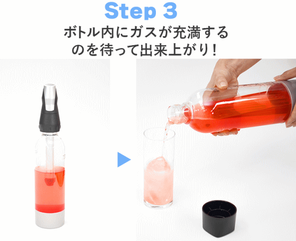 ※スパークリング後、ボトル内の圧力が高まっていますから内容物が吹きこぼれないようノ