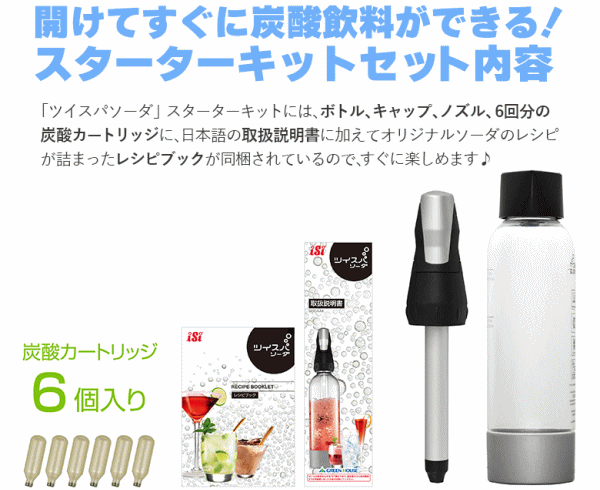 ![]() ■水・ジュース・お酒を炭酸にできる「ツイスパソーダ」 ご家庭で水やジュース、お酒を簡単に炭酸飲料にする事ができるソーダマシンです。お気に入 りの天然水を炭酸にしたりワインをスパークリングワインにする事ができます。 ■独自構造で水以外の飲み物を直接炭酸にできる 構造上、ボトルとノズルの間から圧力が逃げる仕組みになっているので圧力の逃げ道にジュー ス等の添加物が詰まる危険はありません。またノズルの炭酸噴射口も逆流防止設計により飲み 物の逆流を防止しているため水以外の飲み物も安心して炭酸にする事ができます。 ■オリジナルソーダやカクテル、ハイボールを家でもアウトドアでも作れる アウトドアやパーティーでいろいろな種類のお酒やジュースのオリジナルアルコール飲料を作 ったり特にお酒好き方は自分だけのとっておきのレシピを考えてお酒の楽しみを広げてみまし ょう。もしかしたら思いもよらないものを炭酸にする事でビックリするほどおいしいレシピが 発見できるかもしれません。 ■電源不要!普通の水がすぐに炭酸水に変身! 「ツイスパソーダ」スターターキットにはボトル、キャップ、ノズル、6回分の炭酸カートリ ッジに日本語の取扱説明書に加えてオリジナルソーダのレシピが詰まったレシピブックが同梱 されているので買ってすぐに楽しめます。使用方法も簡単なので誰でも手軽に楽しめます。 ■水なら950ml、ジュースやお酒などは720mlの炭酸飲料が作れる 炭酸カートリッジ一本で水なら950ml、ジュースやお酒等は720mlの炭酸飲料が作れるので経 済的です。 ■ドリンクの量が少なくても大丈夫!炭酸が抜けた炭酸飲料も復活できる ドリンクの量が少なく炭酸ガスが噴出するノズルにドリンクが届かなくてもそのままスパーク リングできます。少量でもしっかりと炭酸を注入させる事ができるので飲み残して炭酸が抜け た炭酸飲料を復活させたりお試しで少量のドリンクを作るのにも大変便利です。 ■信頼のヨーロッパ(オーストリア)生産品 ウィーン発、オーストリアの厳しい品質基準をクリアした安心・安全の信頼性の高い製品です。 ![]() ![]() ![]() ![]() ![]() ![]() ![]() ![]() ![]() |