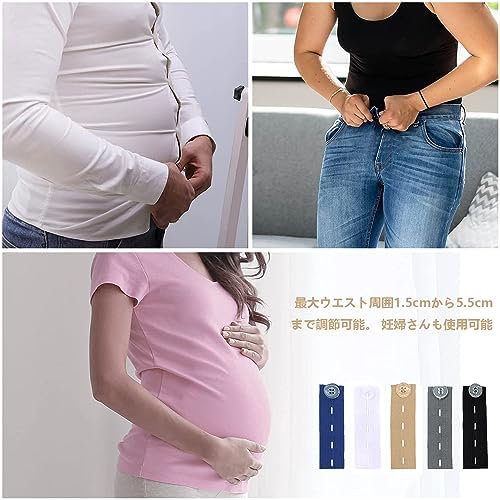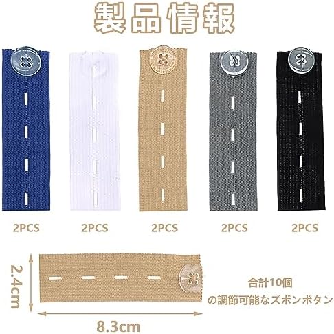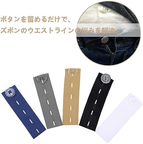 【パッケージ内容】ウエストアジャスター10個入り、黒 2、白 2、紺 2、カーキ 2、ダークグレー 2、ウエスト調節可能、本体はポリエステルとデニム製、ボタンはプラスチック製、お手持ちのズボンにぴったり合います。