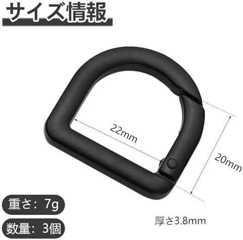 【製品仕様】D型バックルの内幅は約22mm、長さは約20mm、糸の太さは約3.8mm、個々の重さは約7g。パッケージには3個のD型バックル含まれています。