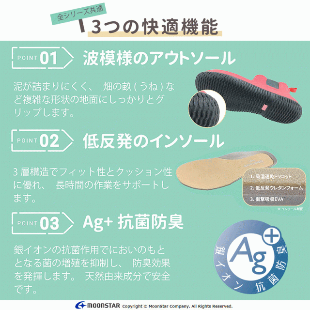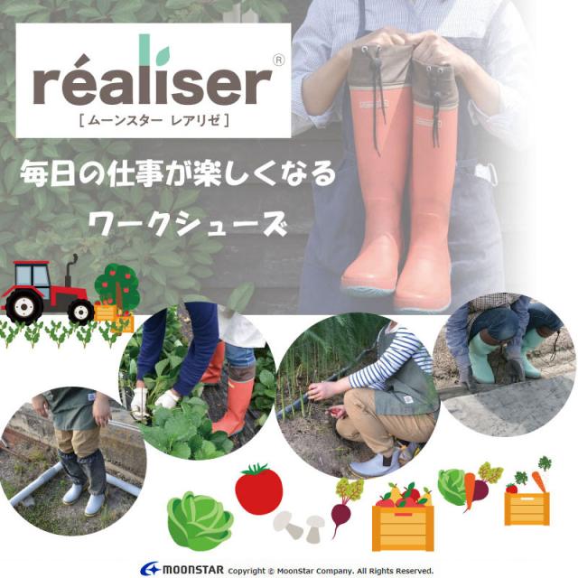 【商品特徴】 自分のなりたい姿、スタイルを実現させ、毎日の仕事が楽しくなる、気持ちがアガる靴が欲しい!といった働く女性の願いをきっかけに、女性農業従事者と一緒に考え、作り上げたシューズ「realiser(レアリゼ)」に、胴周りがゆったりモデルが登場。冬場の重ね着でもゆったり履け、快適に作業できます。UNISEXモデルで幅広いサイズレンジがあります。夫婦コーデにお勧めです。ぬかるんだ場所でのフィット性や、しゃがんだ作業を考慮して、胴は柔らかく設計しています。屈曲の良いロール底は作業時も裸足感覚で、泥の目詰まりを軽減します。胴部を巻くことで軽量コンパクトになりアウトドア等の持ち運びにも便利です。胴丈は40cm、重量は片足約530g(どちらも23.ocm時)です。【機能性カップインソール】取り外しができ、さまざまな機能を持たせたインソールです。【Ag+抗菌防臭】銀イオンの抗菌作用でにおいのもととなる菌の増殖を抑制し、防臭効果を発揮します。天然由来成分で安全です。【耐摩耗ラバー】すり減りが少なく高い耐久性を発揮するラバーを使用しています。