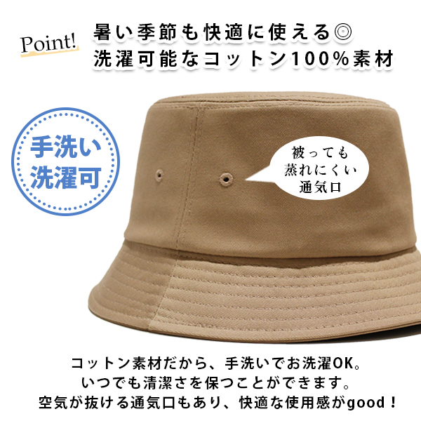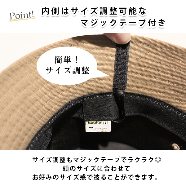 つば短めタイプのシンプルなバケットハット。短めのつばで今っぽさを演出。折り畳んでバッグの中に収納できる手軽さもgood♪内側はサイズ調整のできるテープ付き◎ゆったりとしたサイズ感のハットなので窮屈感なくかぶれて、頭のサイズに合わせて調整を行えばぴったりフィットしてずれずに快適!UV99.9%以上カットなので普段使いにはもちろん、キャンプやアウトドア、行楽シーズンにもおすすめです!こちらの商品は、メール便送料無料で発送致します。