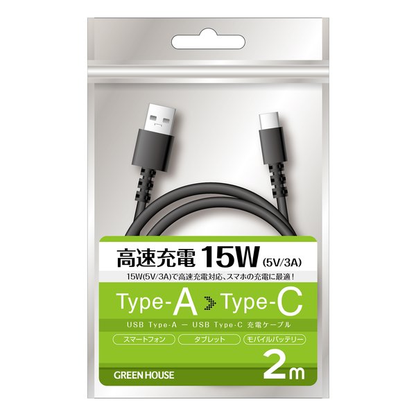 GREEN HOUSE (グリーンハウス) USB2.0 ケーブル TypeA-C 15W 2.0m ブラック GH-UCACA20-BK