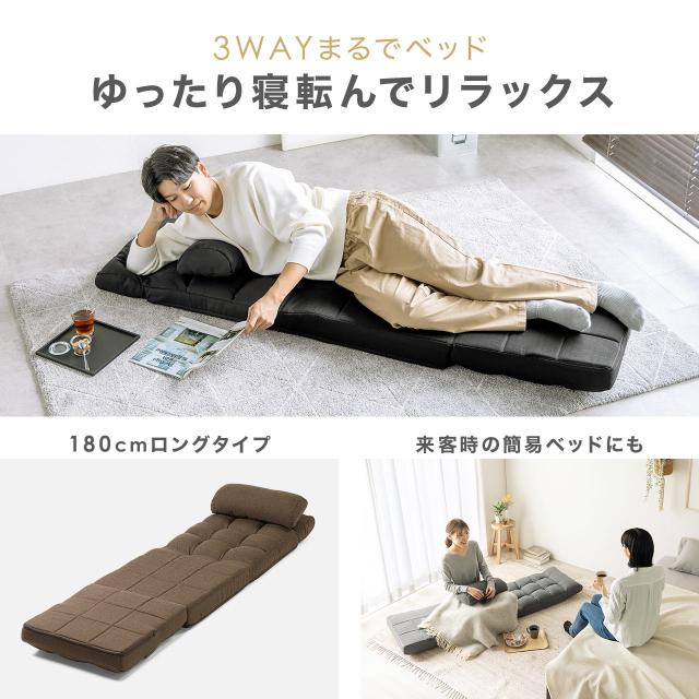 ⇒ご購入の前にご確認下さい弾力があり、座り心地が良いダブルクッション座椅子。2重になっているので腰などへの負担を大幅に軽減。クッションを伸ばして座面の広い座椅子として使用可能。背もたれを倒せばソファベッドの様に使用可能。ヘッドレストは6段階で角度調節可能。ランバーサポートや枕として使えるクッション付属。1年通して使えるファブリック生地を採用。【WEB限定商品】