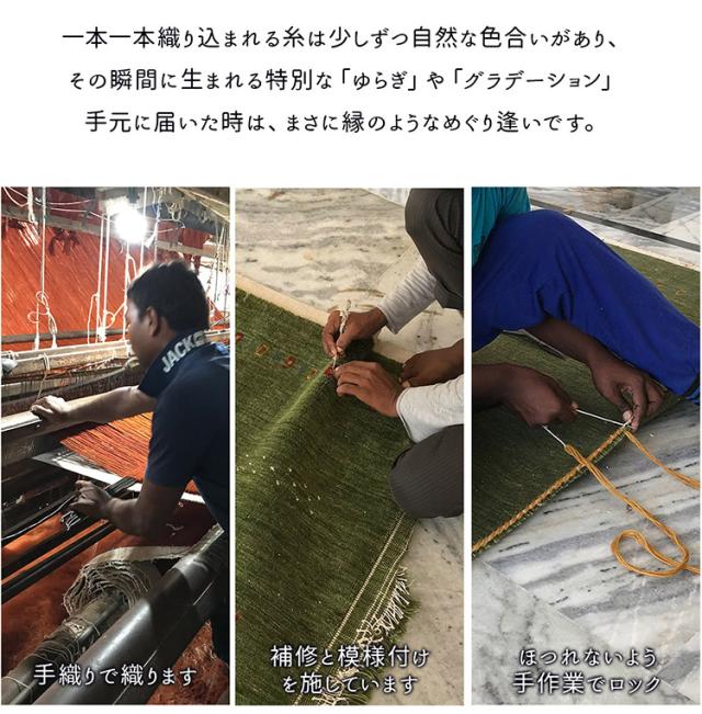 なめらかな肌触りと程よいボリューム感。願いや思いが込められた文様がポイントのインド製手織りギャッベ。