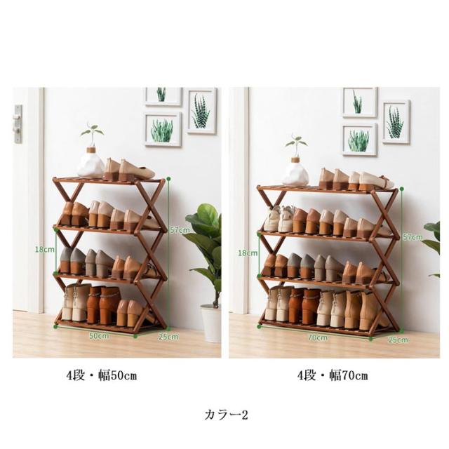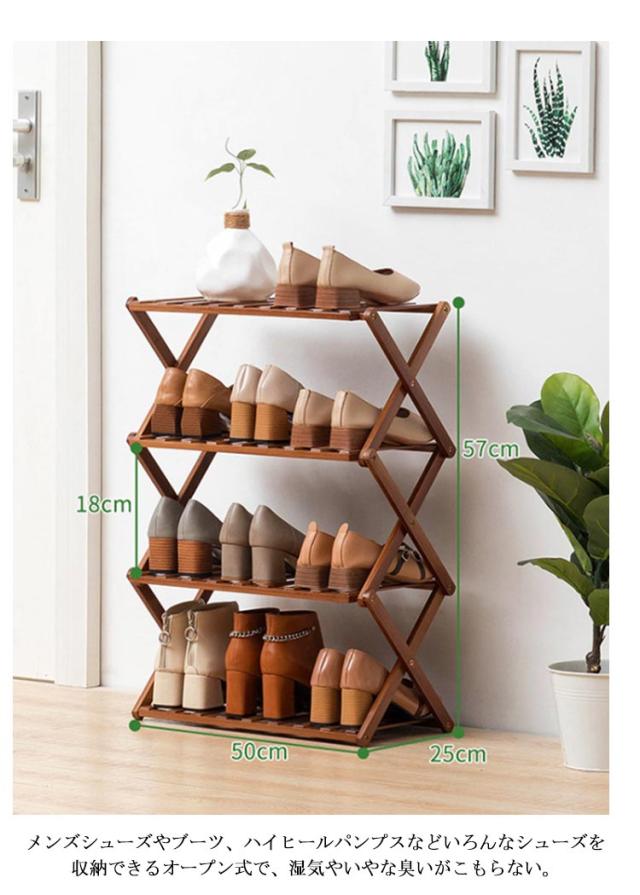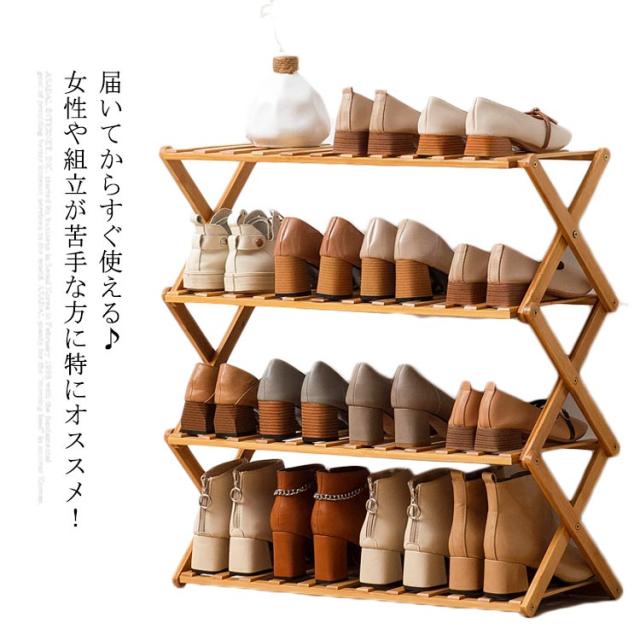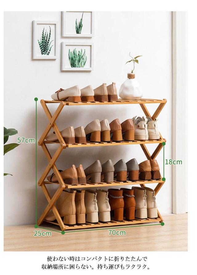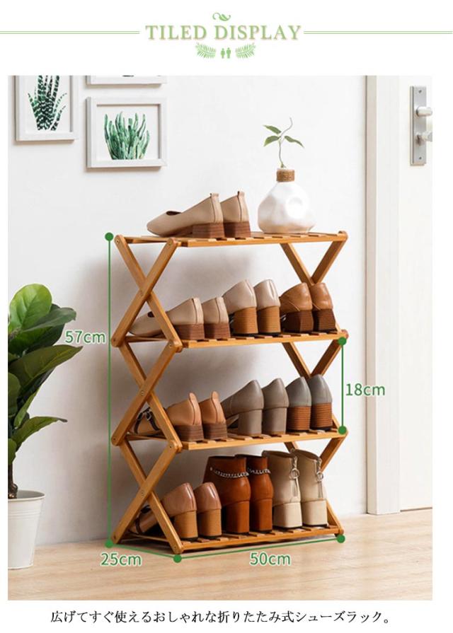 すぐ使える♪ シューズラック 4段 玄関収納 靴箱 オープンラック 組立不要 折りたたみ式 靴棚 花置き 伸縮 組立不要 竹製 収納棚 ラック