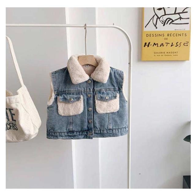デニムベスト ボアベスト フェイクファー ユニセックス 男の子 女の子 アウター 厚手 防寒 オーバーサイズ BIGシルエット ふわふわ 子供服 羽織り 幼稚園 小学生 体温調整 韓国ファッション