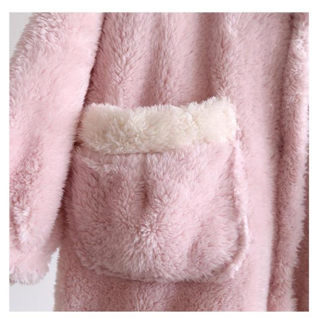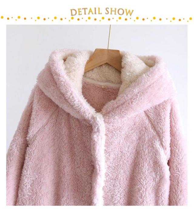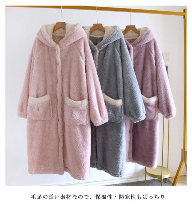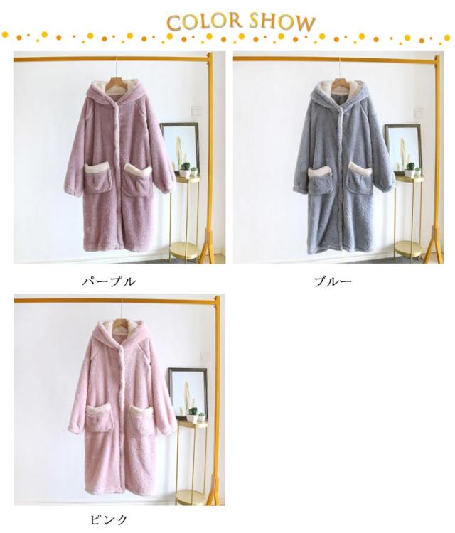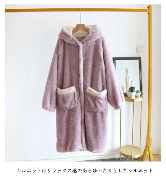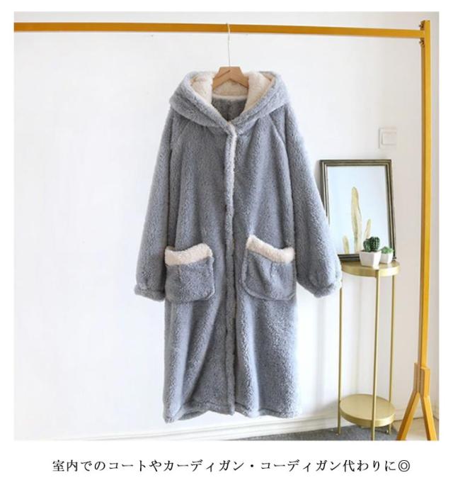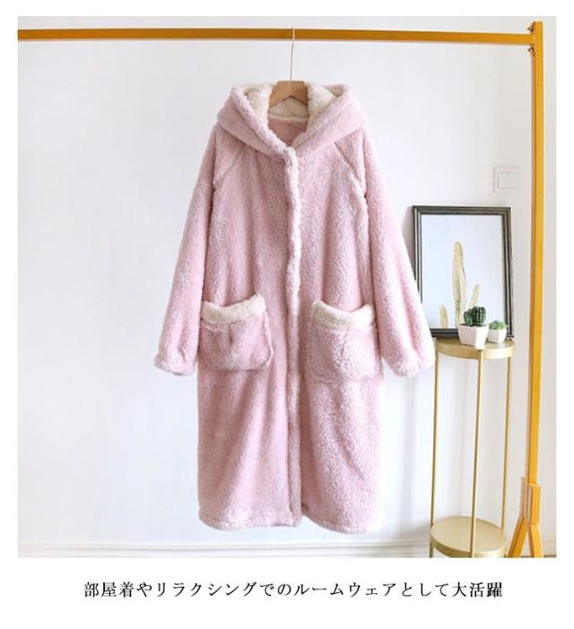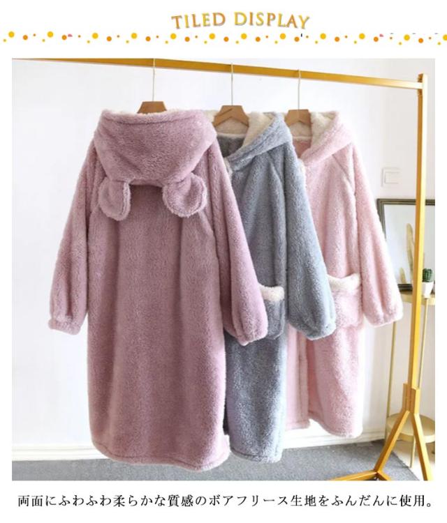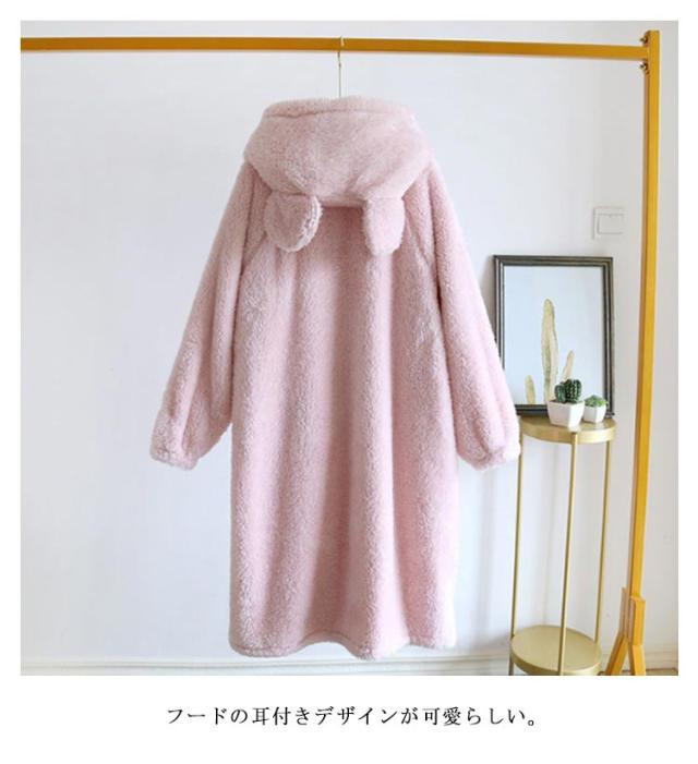 着る毛布 レディース ロング ガウン バスローブ ボアフリース もこもこ 冬 ルームウェア ワンピース パジャマ 部屋着 長袖 羽織り ボタン 前開き フード付き ポケット付き 厚手 暖かい あったか ホームウェア 防寒 保温 テレワーク 寒さ対策 耳付き 可愛い