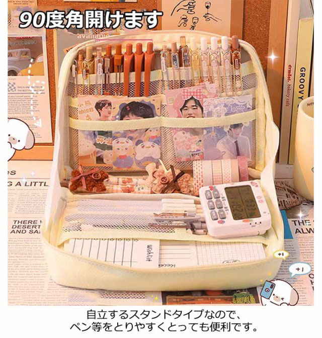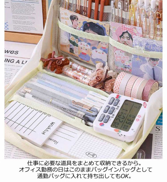 | スマートにスタンドするペンケース ペン、定規、付箋など必要な文具をまとめて収納でき、そのままデスク上で自立するスタンド型ペンポーチ。 自立するスタンドタイプなので、ペン等をとりやすくとっても便利です。 仕事に必要な道具をまとめて収納できるから、 オフィス勤務の日はこのままバッグインバッグとして通勤バッグに入れて持ち出してもOK。 たっぷり収納してもスリムなサイズでかばんの中や出先でスマートに持ち歩けます。 | |
