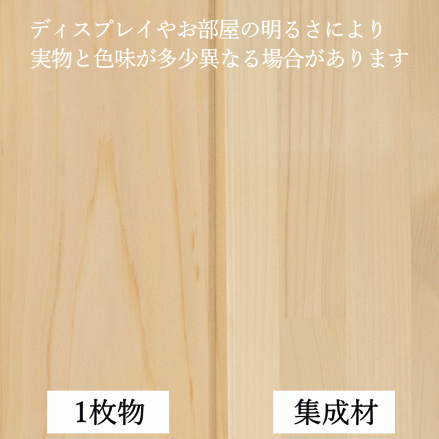 | 備考 | ・本商品は天然自然木を使用している為、ご使用にあたり支障のない程度の節割れや欠け節が入る場合があります。あらかじめご了承下さい。また、節の付いてある製品は、節をパテ仕上げしている物もあります。 ・無塗装品ですので、表面の塗装をする事も可能です。 ・経年変化により色合いが味わい深く変化します。 【一枚物】 ・一枚物は天然の無垢材により、調湿性があるため反りが発生しやすくなっております。 ・環境の変化により伸縮、割れなど発生する場合があります。 【集成材】 ・天然原木を重ね合わせた木材なので、板ごとに継ぎ目、木目や色合いが多少異なります。 ・一枚物よりも強度がありますが同様に、環境の変化により伸縮、割れなど発生する場合があります。 |