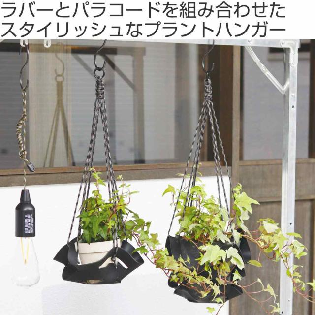 ラバー素材とパラコードを組み合わせたプラントハンガーです。パラコードの先端にはリングが付属しており、S字フックなどと組み合わせて好きな場所でハンギングをお楽しみいただけます。Lサイズは4号〜5号(直径120mm 〜直径150mm)の鉢に対応しています。