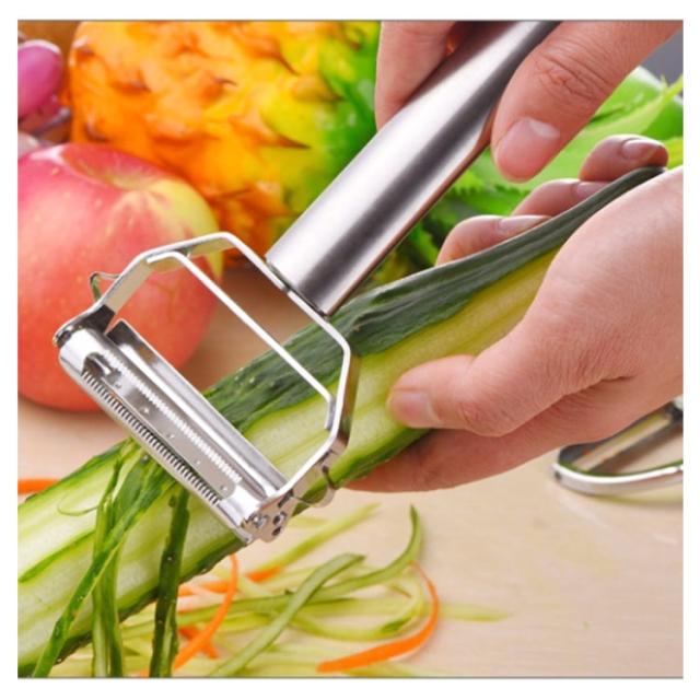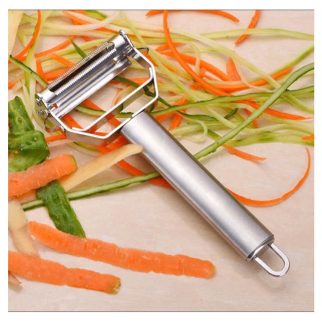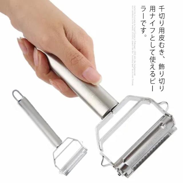 | 千切り用皮むき、飾り切り用ナイフとして使えるピーラーです。 人間工学に基づいた握りやすいハンドル設計で、快適に使えます。 錆びにくいステンレス刃を使用しているため衛生的で、お手入れも簡単です。 大根、ニンジンなどを千切りにしてサラダにしたり冷やしのきゅうりを作ったりと非常に実用的です。 | |