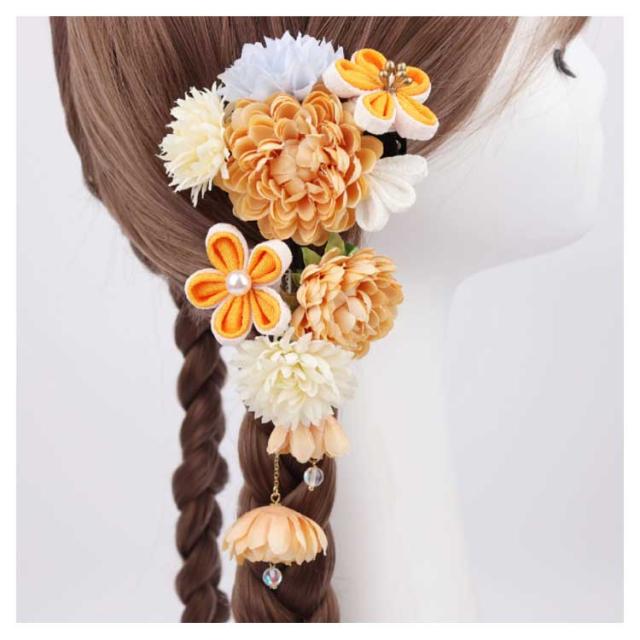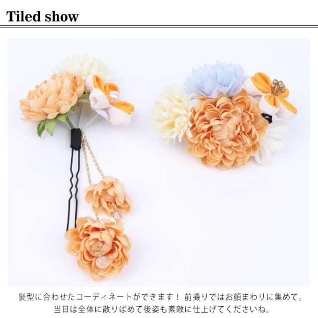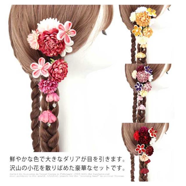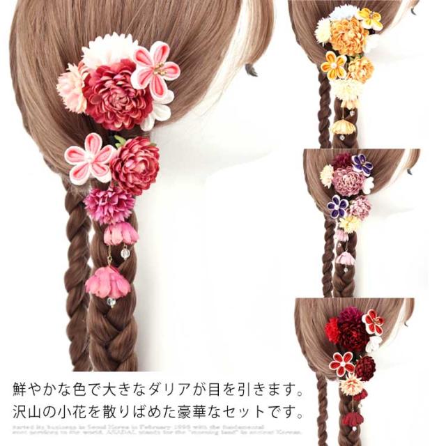 | 鮮やかな色で大きなダリアが目を引きます。沢山の小花を散りばめた豪華なセットです。 髪型に合わせたコーディネートができます! 前撮りではお顔まわりに集めて。 当日は全体に散りばめて後姿も素敵に仕上げてくださいね。 主に一越ちりめんを使用して仕上げています。 華やかな和装に合わせていただくと、とっても素敵です(≧∀≦) 特別な日には伝統的なつまみ細工の髪飾りはよく映えますので、実際にセットした際にまとまりと華やかさがでるようにお作りしています。 | |
