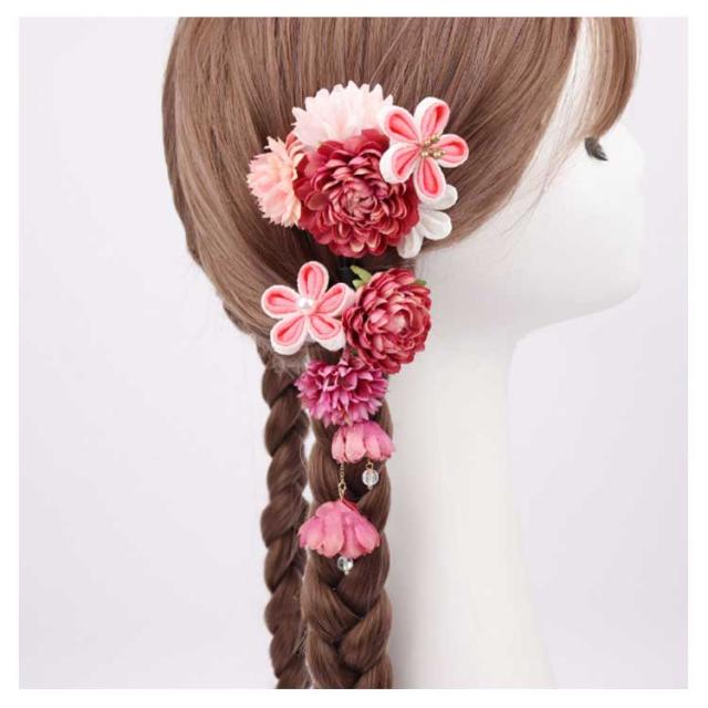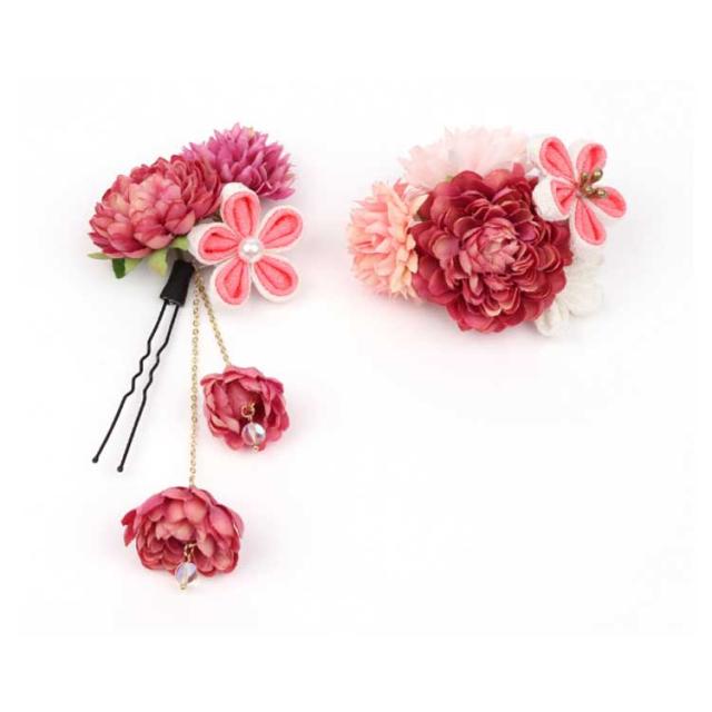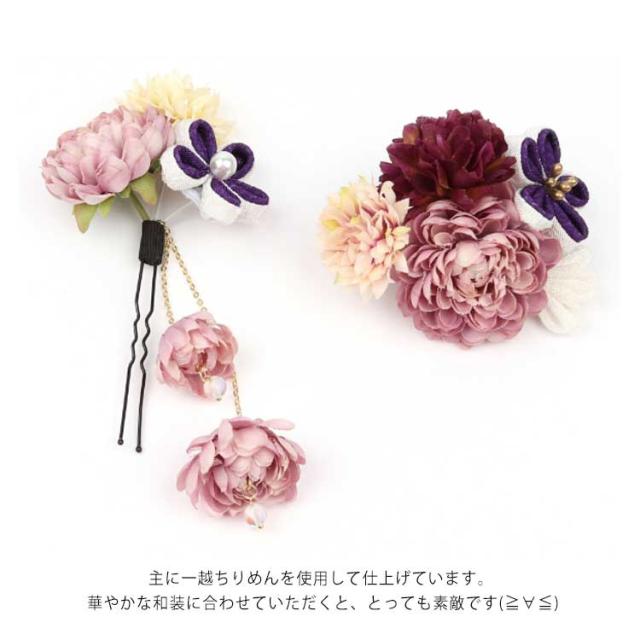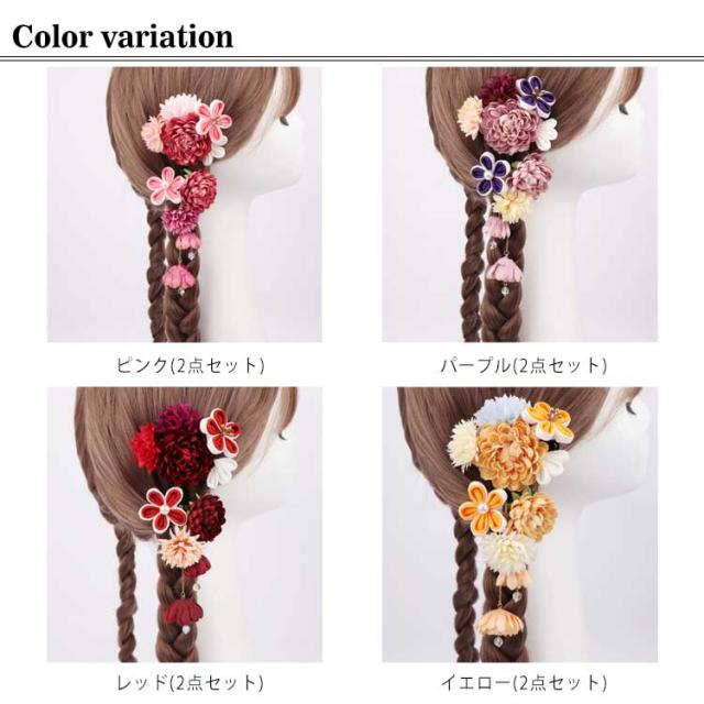 七五三 ドライフラワー 赤 ちりめん 花 和装 着物 浴衣 袴 つまみ細工 卒業式 結婚式 コーム 水引 紐 ショートヘア クリップ Uピン 黄緑 三歳 七歳 セット かんざし 三歳 七歳
