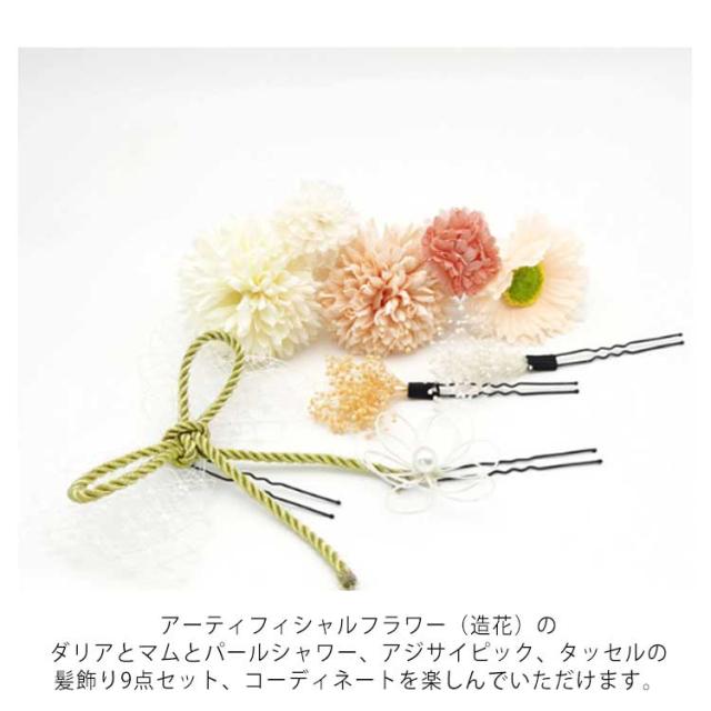| 【髪飾り9点セット】メイン素材:安全で無臭の高品質ポリエステルを使用。枯れる心配がない鮮やかな造花は飾るだけで和風ヘアスタイルが手軽に仕上がり、和服の髪飾り、浴衣のヘアーアクセサリー、成人式や結婚式の髪飾りに最適です。 【プレゼントにも最適】アーティフィシャルフラワー(造花)のダリアとマムとパールシャワー、アジサイピック、タッセルの髪飾り9点セット、コーディネートを楽しんでいただけます。アレンジしやすい可愛らしいかみかざりは、幅広い年齢の方に愛用頂けます。友達、妻、娘、母親、大切な方への贈り物にも最適です! 【色とりどり】色とりどりの花が鮮やかで、大小の花が大事な日を彩る、アレンジ次第で大人から子供まで、卒業式、成人式、七五三、花火大会、結婚式、発表会、パーティーなどさまざまなシーンでお使いいただけます。 【つけやすい】お花の後ろにUピンがつき、パールシャワーとタッセルにもUピンをつけております。簡単でつけやすい、様々なヘアースタイルに合わせやすいです。初めての振袖から結婚式等パーティー、夏の浴衣姿など一年通して活躍できる髪飾りです。 | |
