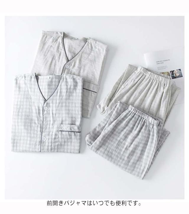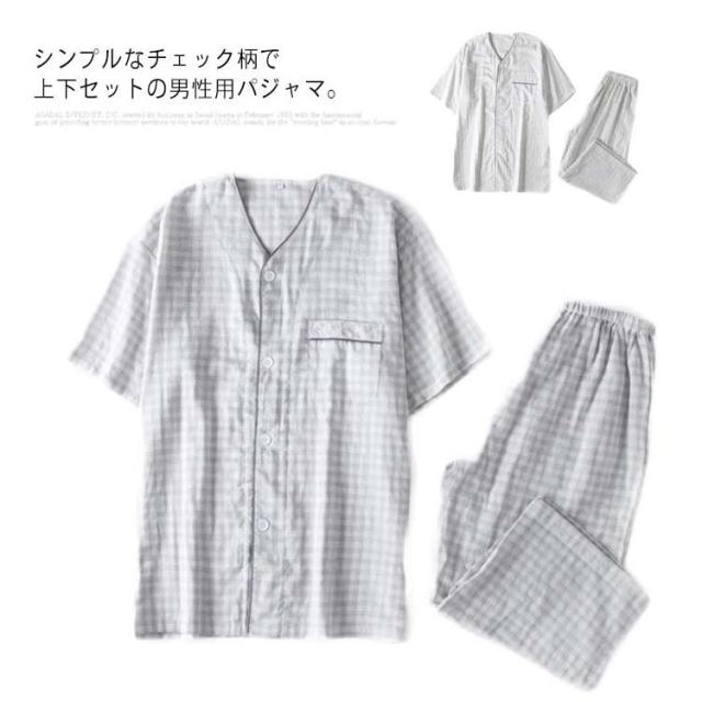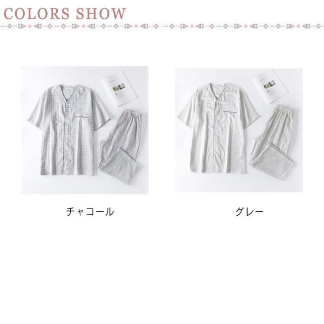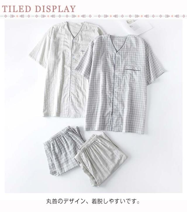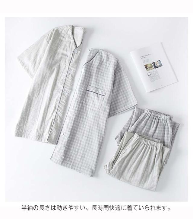 送料無料 パジャマ メンズ ダブルガーゼ ガーゼパジャマ ルームウェア 綿100% コットン シャツパジャマ 上下セット チェック ギンガムチェック 千鳥柄 部屋着 半袖 襟なし 甚平 涼しい ナイトウェア 寝間着 大きいサイズ 通気性 春 夏 薄手