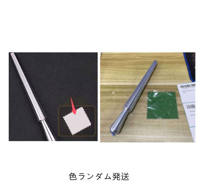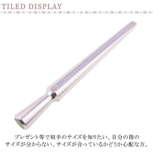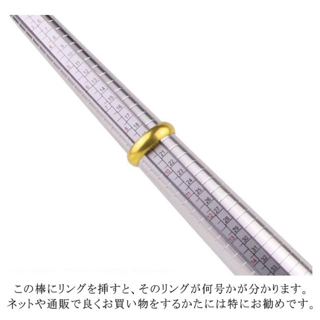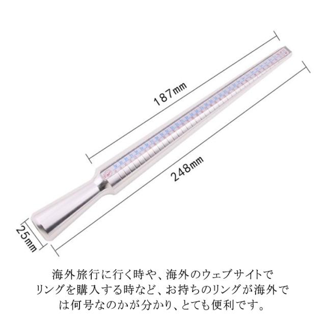 | 4種類規格を同時に表示!日本・欧州・米国・香港、一回の計測で世界4カ国のサイズがすぐわかる。 プレゼント等で相手のサイズを知りたい、自分の指のサイズが分からない、サイズが合っているかどうか心配な方。 この棒にリングを挿すと、そのリングが何号かが分かります。ネットや通販で良くお買い物をするかたには特にお勧めです。 表示は4種類で、日本、アメリカ、ヨーロッパ、香港のリングサイズが、一度に計測できます。 しっかりした作りのアルミニウム製で、耐久性もあり、輸入業者の方、ジュエリー店の方にも好評です。 海外旅行に行く時や、海外のウェブサイトでリングを購入する時など、お持ちのリングが海外では何号なのかが分かり、とても便利です。 | |