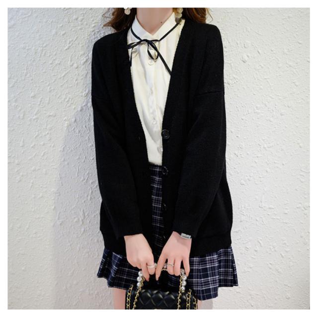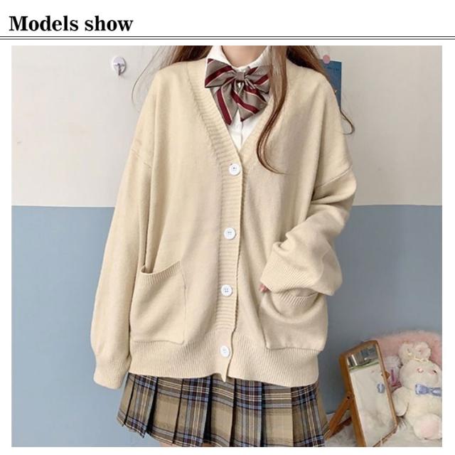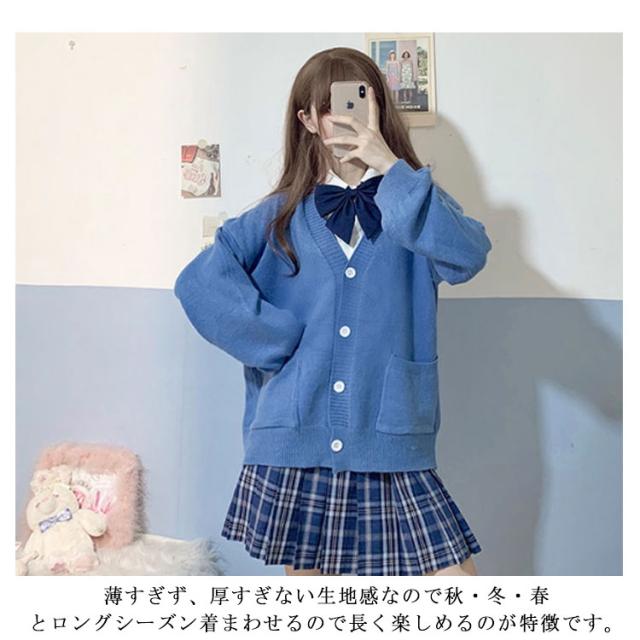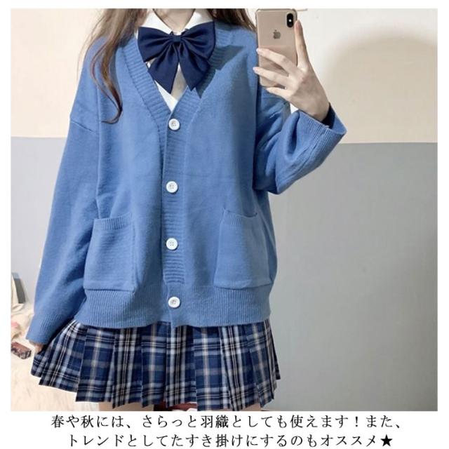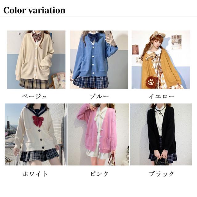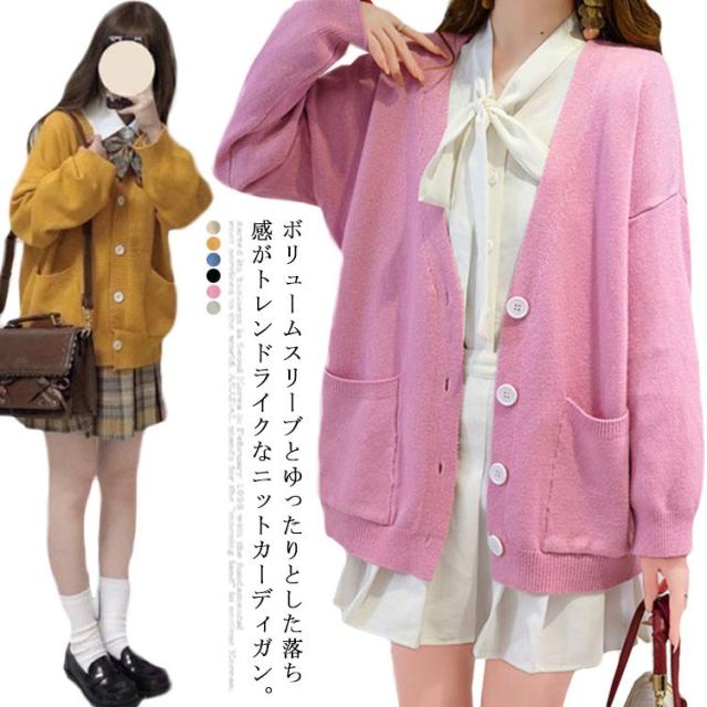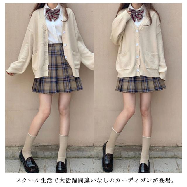 【送料無料】女子 制服 ゆったり Vネック 前開き ニットカーディガン 秋冬 春 羽織り スクールセーター 学生服 高校生 中学生 パフスリーブ 無地 シンプル かわいい ベージュ ホワイト ブラック
