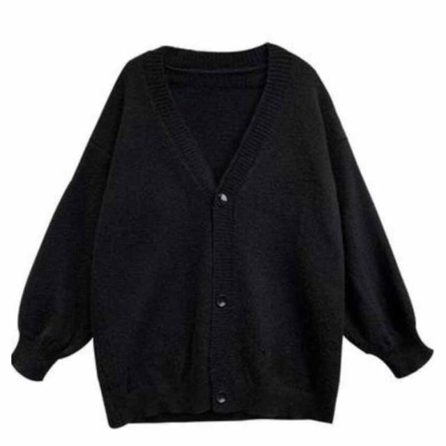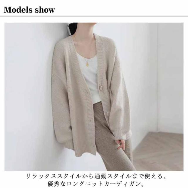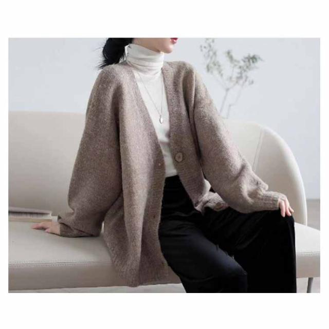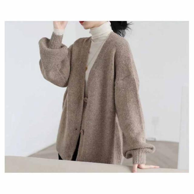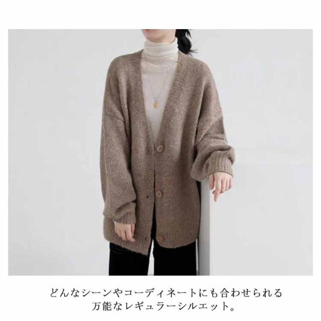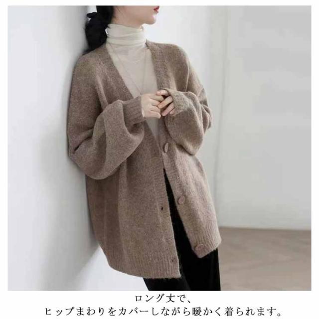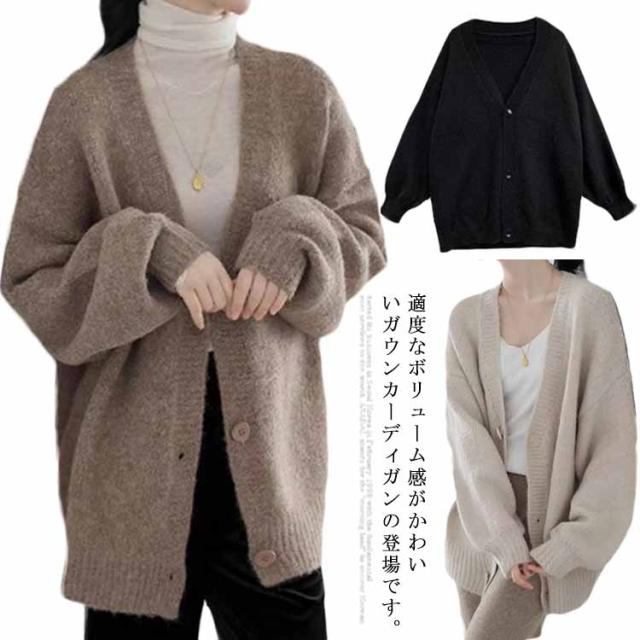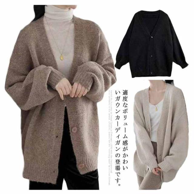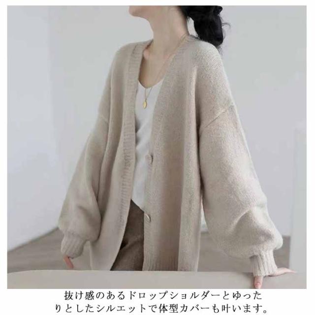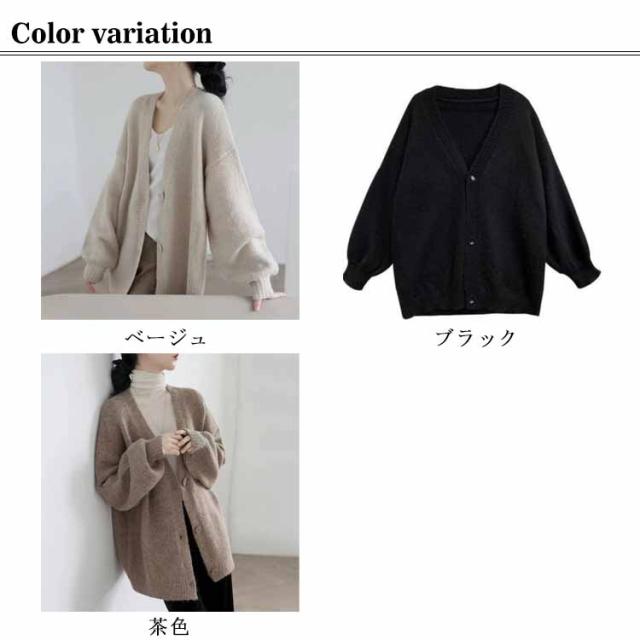 【送料無料】レディース Vネック 前開き 秋冬 春 薄手 ロング ゆったり あったか 羽織り セーター アウター パフスリーブ 無地 シンプル かわいい ベージュ 茶色 ブラック 大きいサイズ おしゃれ