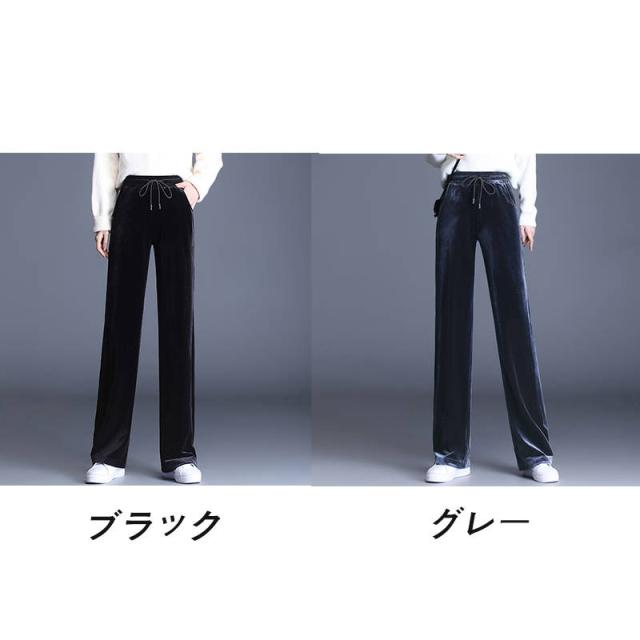 ベロアワイドパンツ レディース ベロア素材 ストレート ロング丈 ガウチョパンツ ゆったり カジュアル 無地 着痩せ 柔らかい ボトムス ウエストゴム 通勤 通学