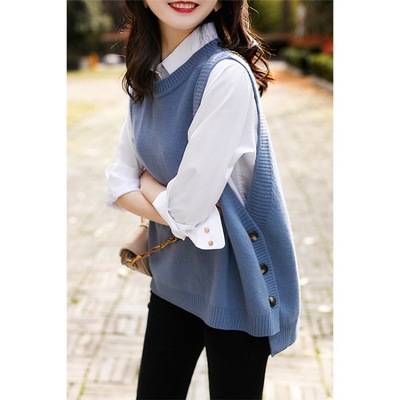 ニットベスト ラウンドネック レディース uネック アシンメトリー サイドボタン ノースリーブ ニットキャミソール スリット 裏ボア おしゃれ カジュアル ゆったり 秋冬
