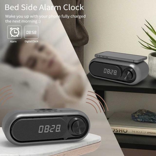 Qi 対応 Bluetooth スピーカー ワイヤレス充電器 高音質 ラジオ 目覚まし時計 5/10W出力 iPhone Android対応 1台4役