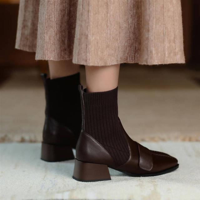 ショートブーツ レディース ソックスブーツ ブーツ チャンキーヒール 秋冬 スムース 太ヒール シンプル 黒 ストレッチ 裏起毛 PU 合成皮革 4.5cmヒール