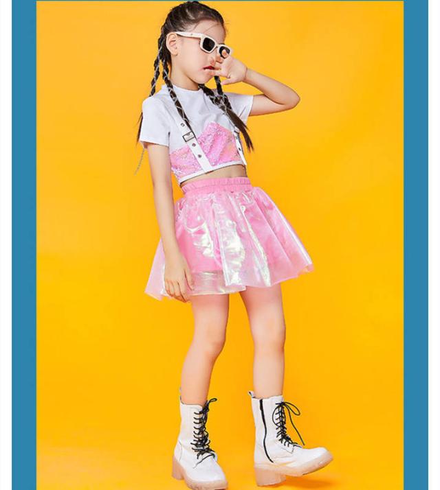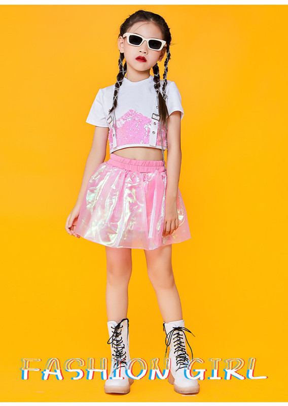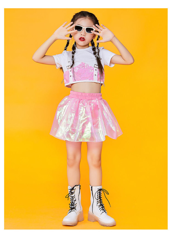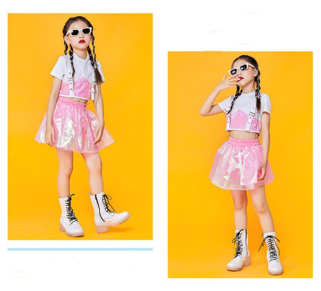 キッズ ステージ衣装 ジャズダンス ガールズ 女の子 セットアップ スカート チア チアガール 演奏会 応援団 韓国 ピンク スパンコール キラキラ 送料無料