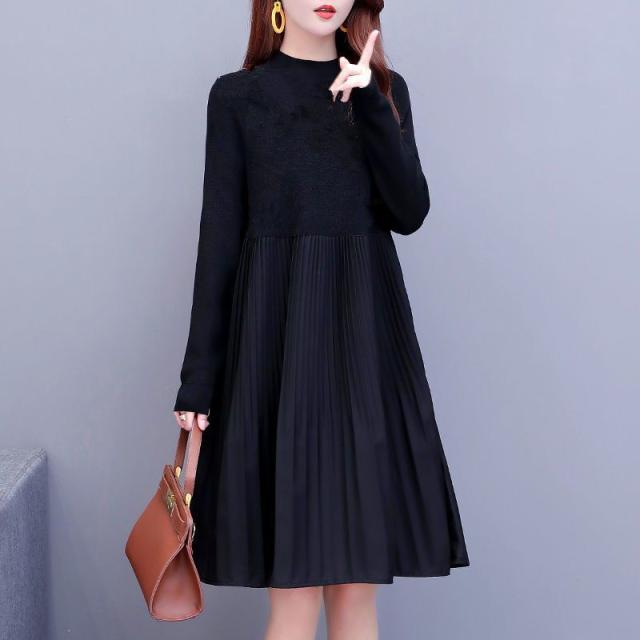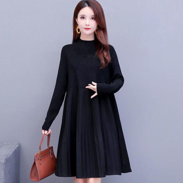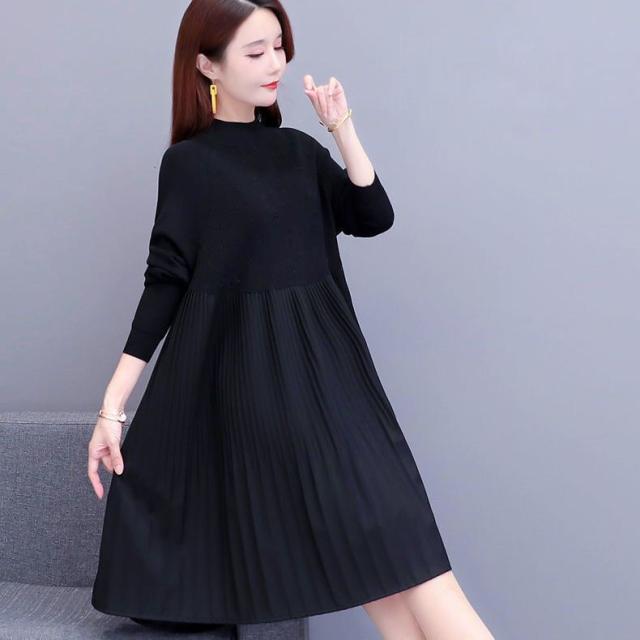 ニットワンピース ニット ワンピース レディース 秋冬 送料無料 春 ハイネック 長袖 パフスリーブ プリーツ ミモレ丈 ブラック きれいめ 厚手 ゆったり 大きいサイズ マタニティ 裾 切り替え 重ね着風 着痩せ