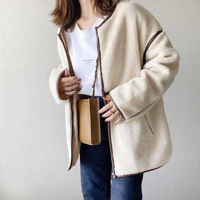 レディース アウター コート パイピングコート 冬 厚手 大きいサイズ オーバーサイズ ゆったり 長袖 ミドル丈 無地 ボア ブルゾン ジップ レザーパイピング ノーカラー ロング ボア ベージュ