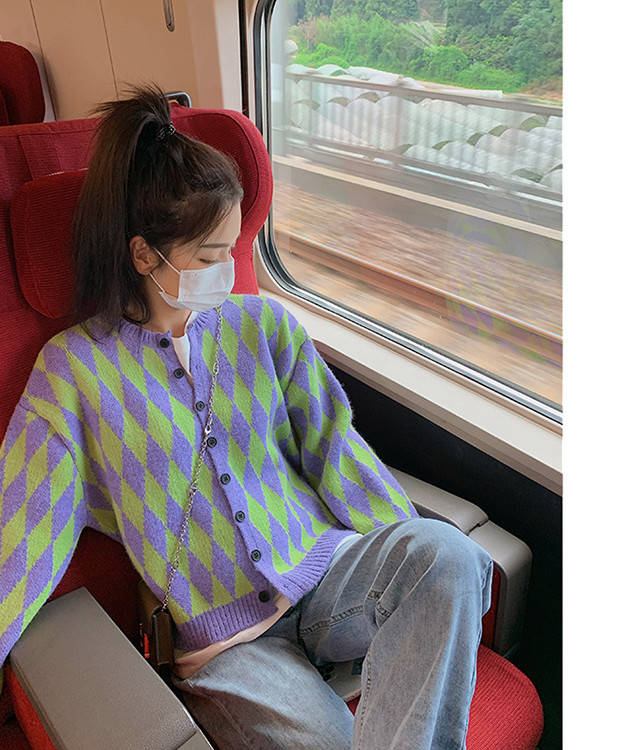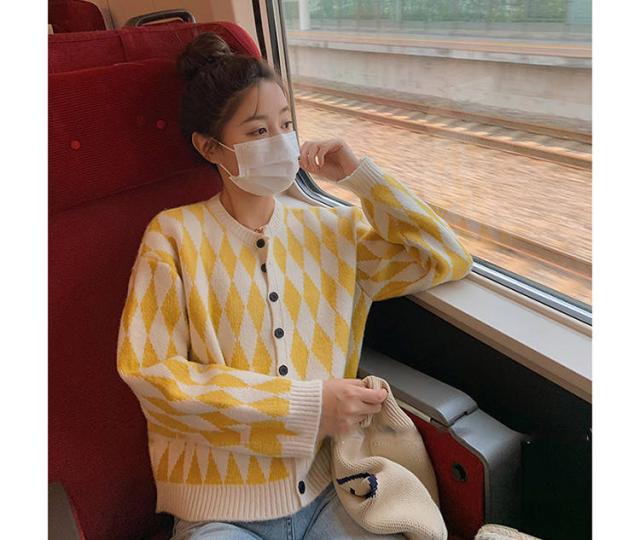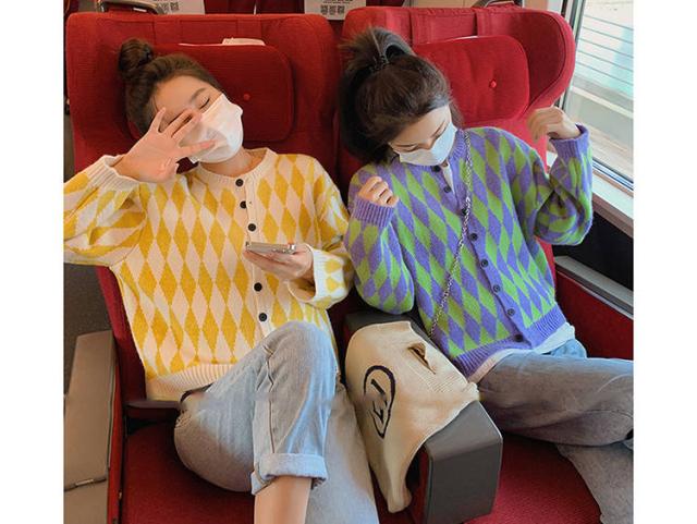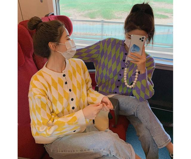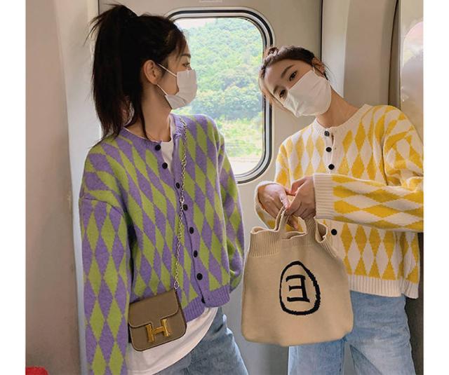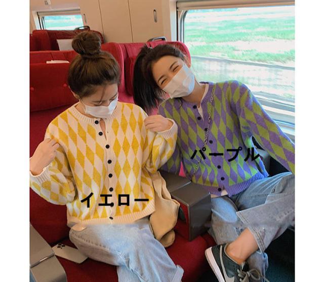 菱形柄カーディガン レディース ニットアウター カーディガン ニットカーディガン 菱形柄 ゆったり カジュアル 春服 秋服 おしゃれ 可愛い チェック柄 ラウンドネック 丸首