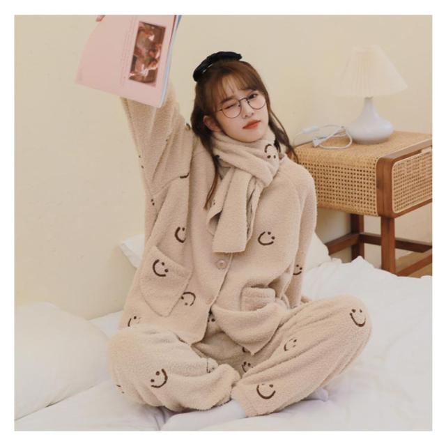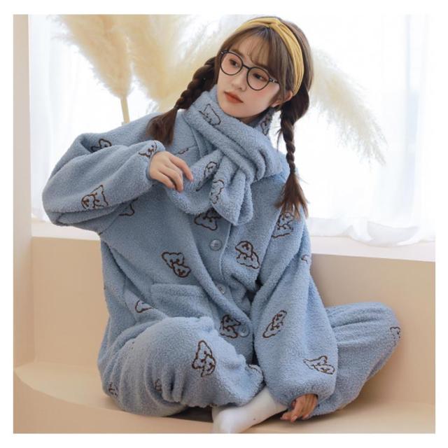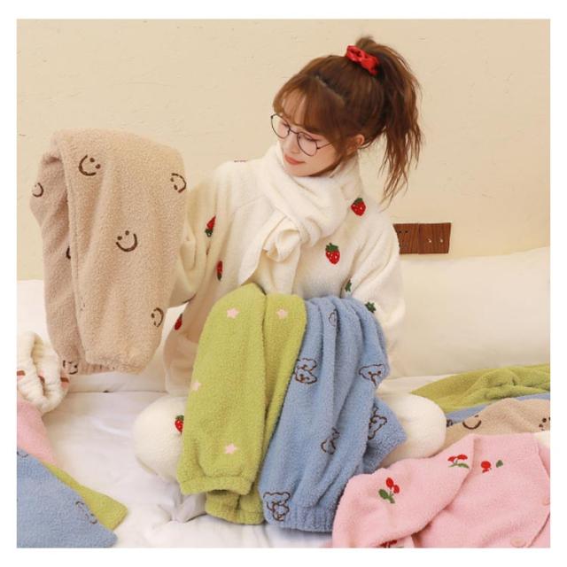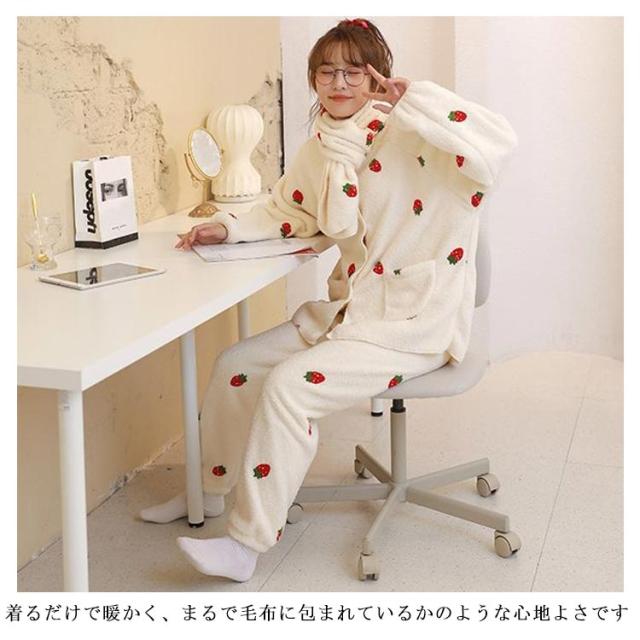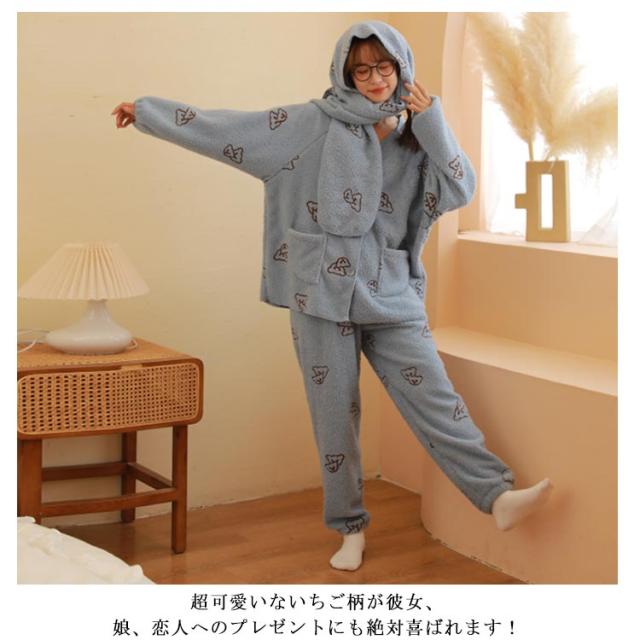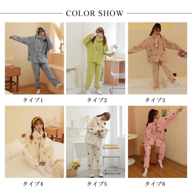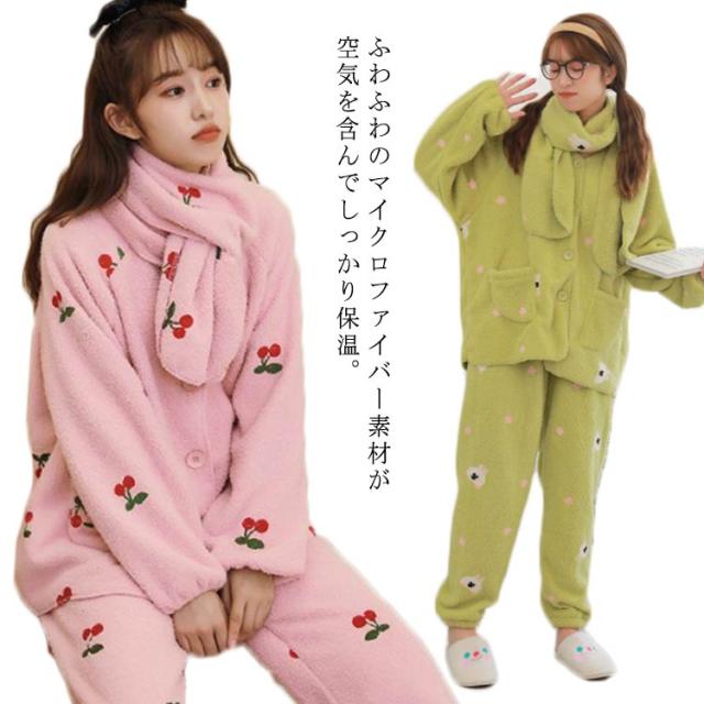 パジャマ ルームウェア もこもこ ふわふわ いちご柄 スカーフ付き いちごパジャマ 可愛い オシャレ SNS超人気 大勧め 防寒 上下セット 上品 暖かい 部屋着 ファッション 肌触りいい ホワイト ピンク グリーン くまちゃん チェリー柄 クリスマス 誕生日